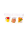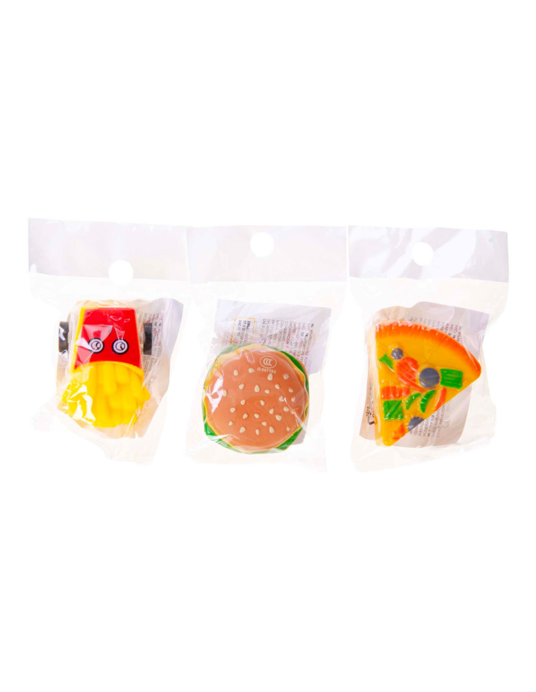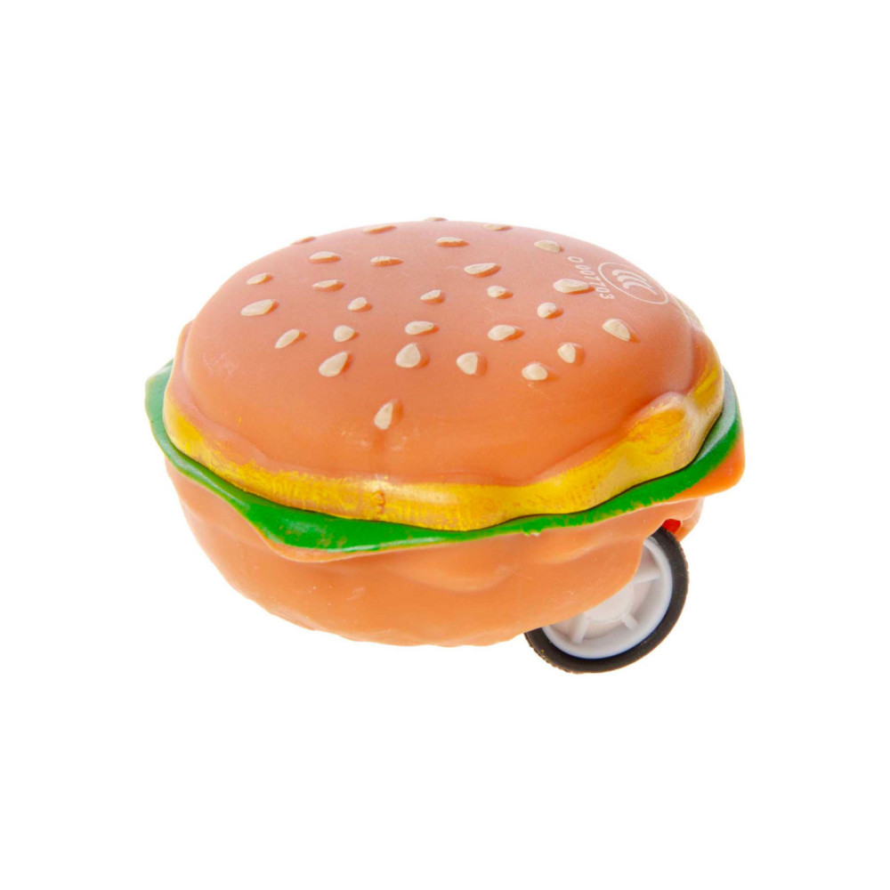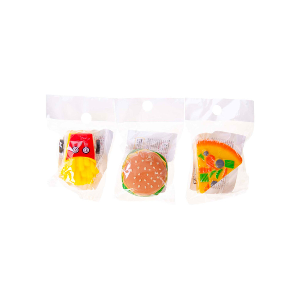 Pull-back voertuig in de vorm van je favoriete fastfood zoals een hamburger of pizzapunt. Afmetingen: 4 x 3 centimeter.