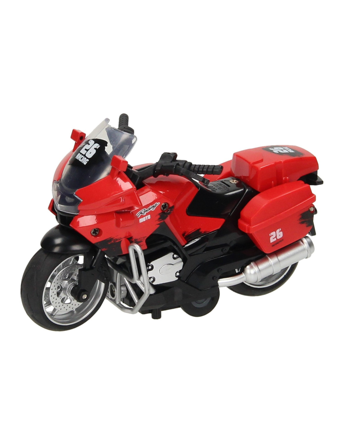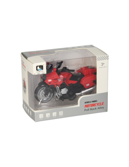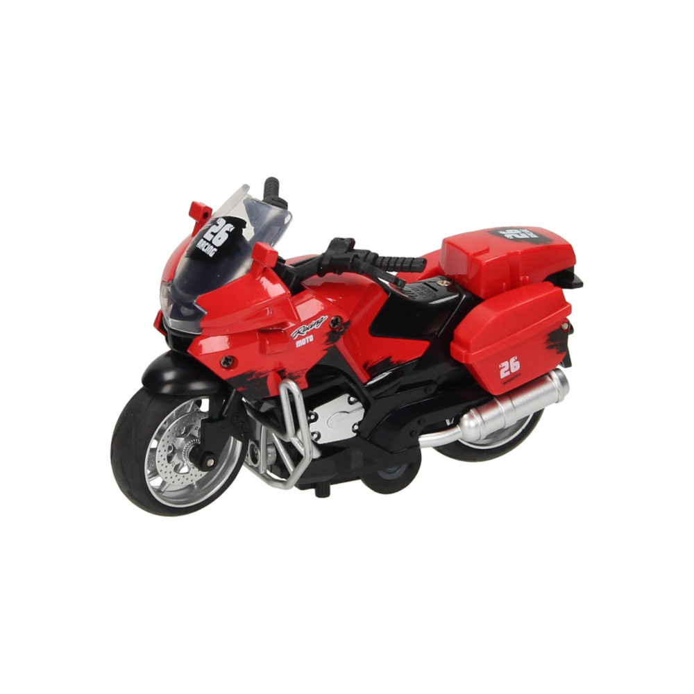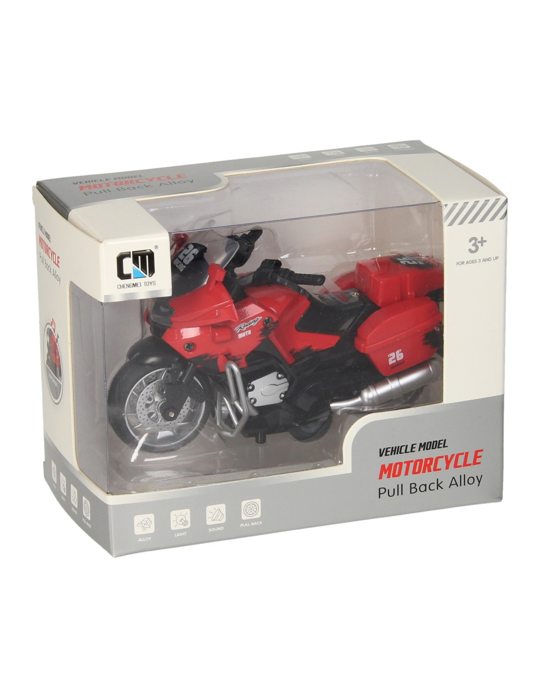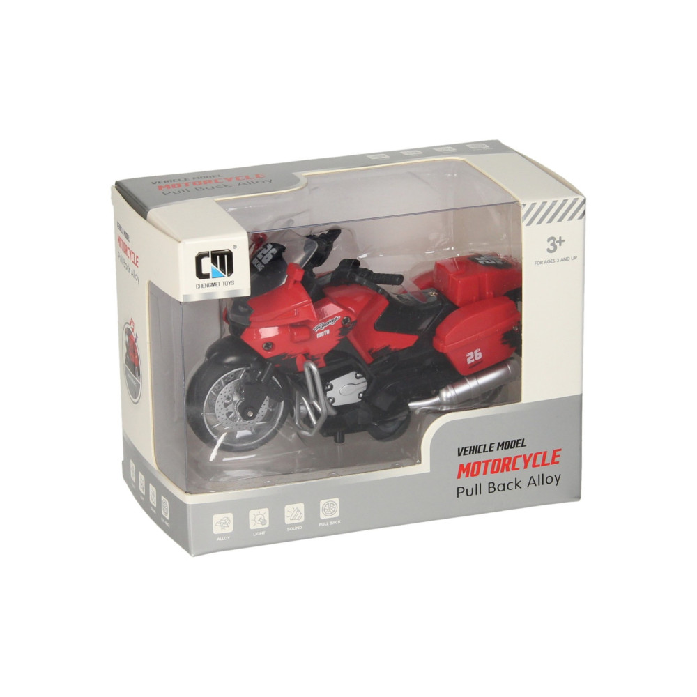 Rode speelgoedmotor met pull-backfunctie en licht- en geluidseffecten. Gemaakt van metaal en kunststof. Geschikt voor kinderen vanaf 3 jaar oud. Werkt op 3 knoopcelbatterijen (inbegrepen)