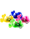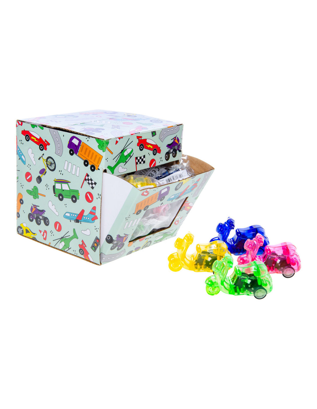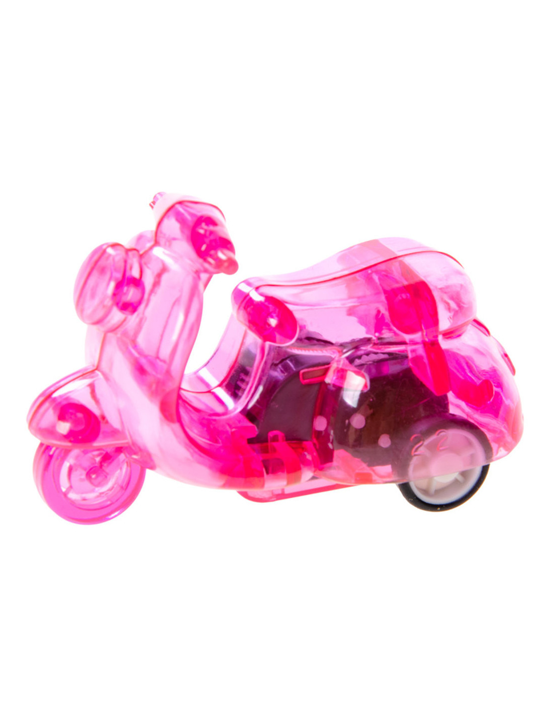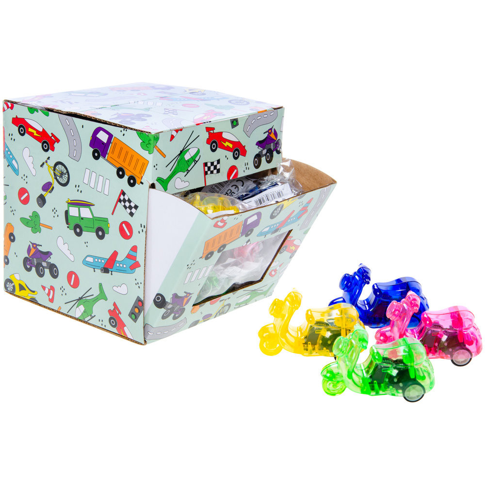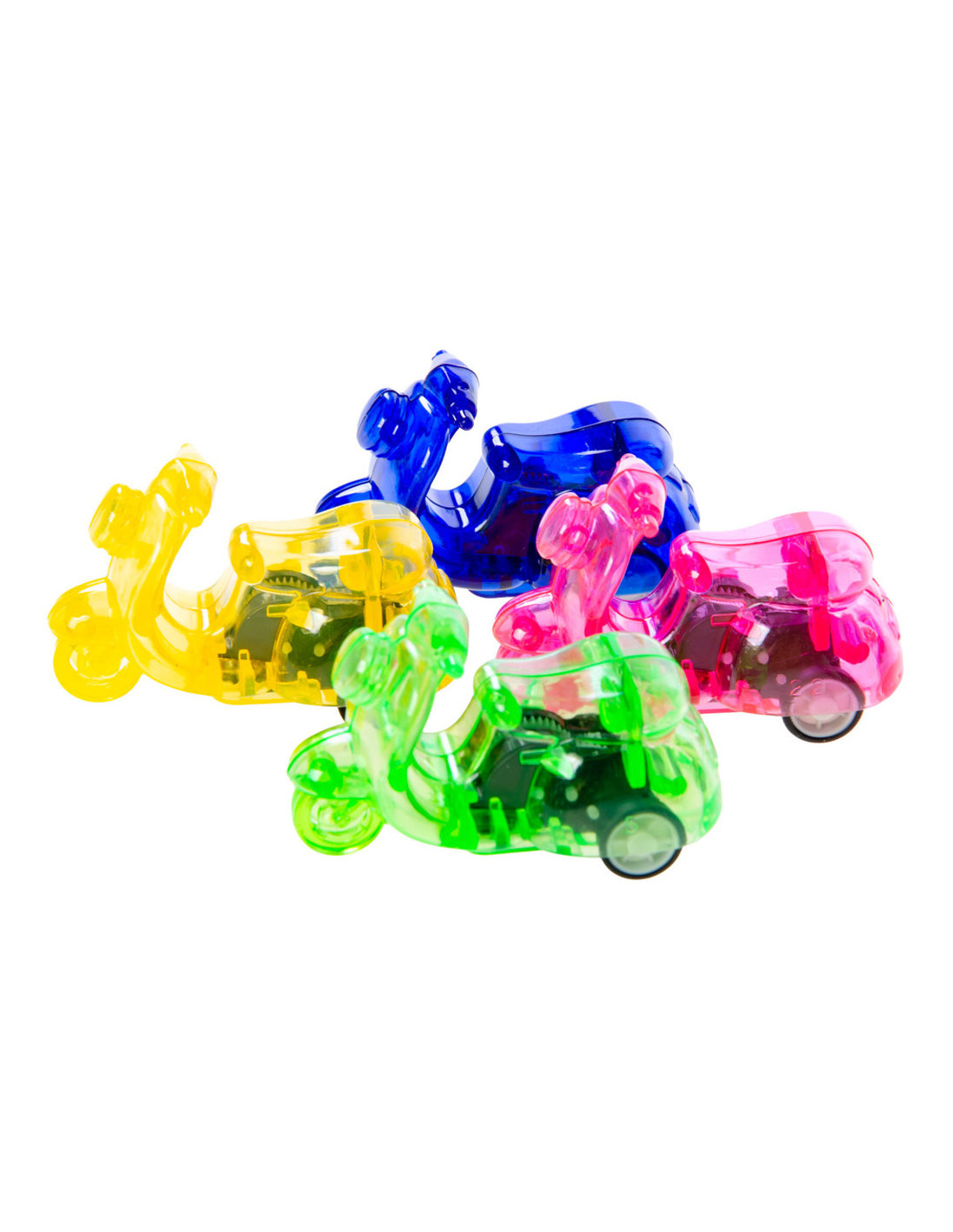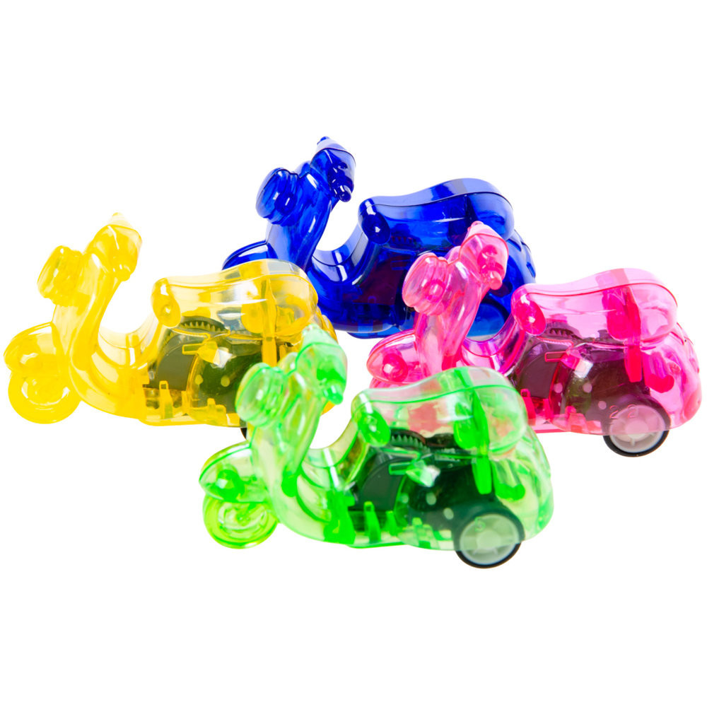 Transparante scooterspeeltjes met pull back mechanisme zorgen voor extra speelplezier. Door het figuurtje naar achteren te trekken en los te laten, schiet het vooruit over de grond. De scooter is gemaakt van gekleurd transparant kunststof, waardoor de bewegende onderdelen van binnen goed zichtbaar zijn. Dat geeft een speels en technisch effect dat kinderen direct aanspreekt.