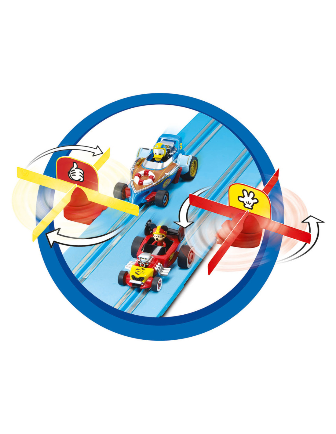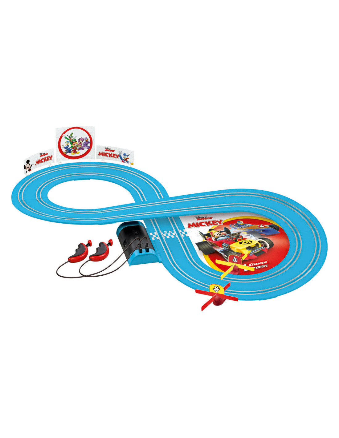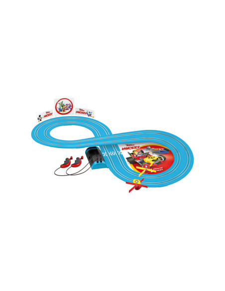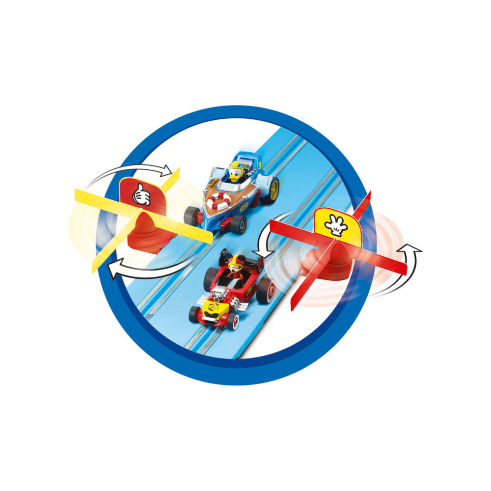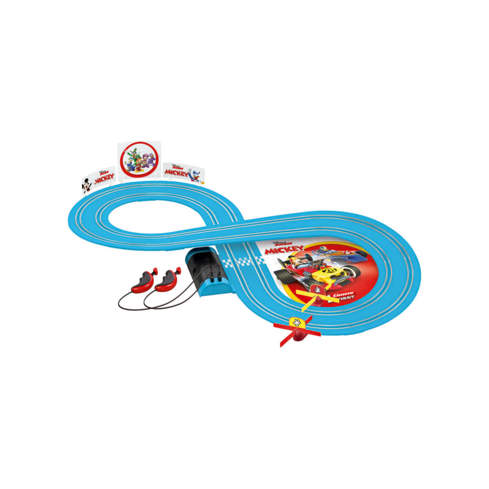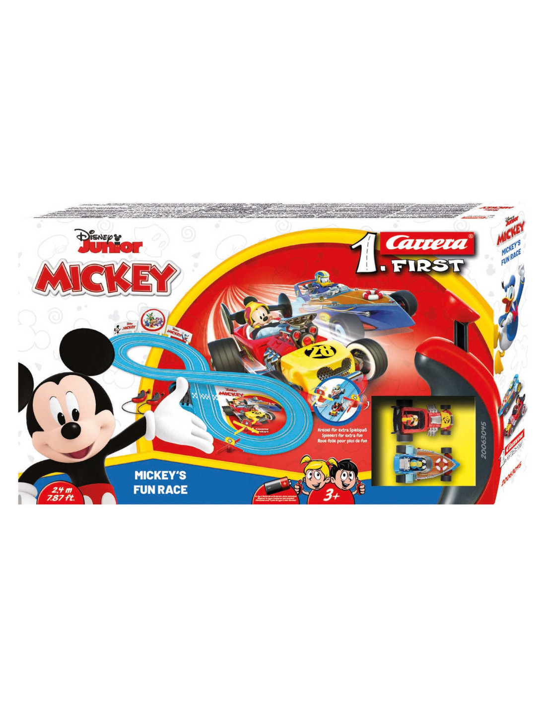 Plezier met Mickey Mouse en Donald Duck! De twee vrienden Mickey en Donald komen naar je kinderkamer! Met de Carrera FIRST "Mickey - Fun Race" set, zoeven de twee kinderen all-stars over je 2,4 meter lange, blauwe fairway. Het bijzonder kleurrijke circuit en de gedetailleerde speelgoedauto's overtuigen in ieder geval dankzij de originele licentie! De track trekt de aandacht met de Mickey Mouse decoratieve elementen, zoals de grappige spinning top in de kinderkamer. Dankzij de langdurige batterijwerking en het eenvoudige plug-insysteem is de Carrera FIRST-set ideaal voor op reis. Geschikt vanaf 3 jaar.