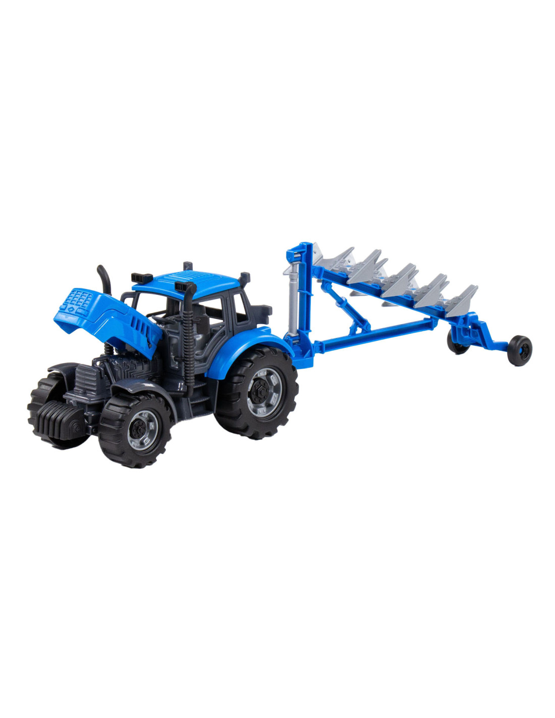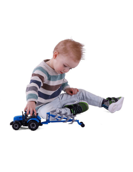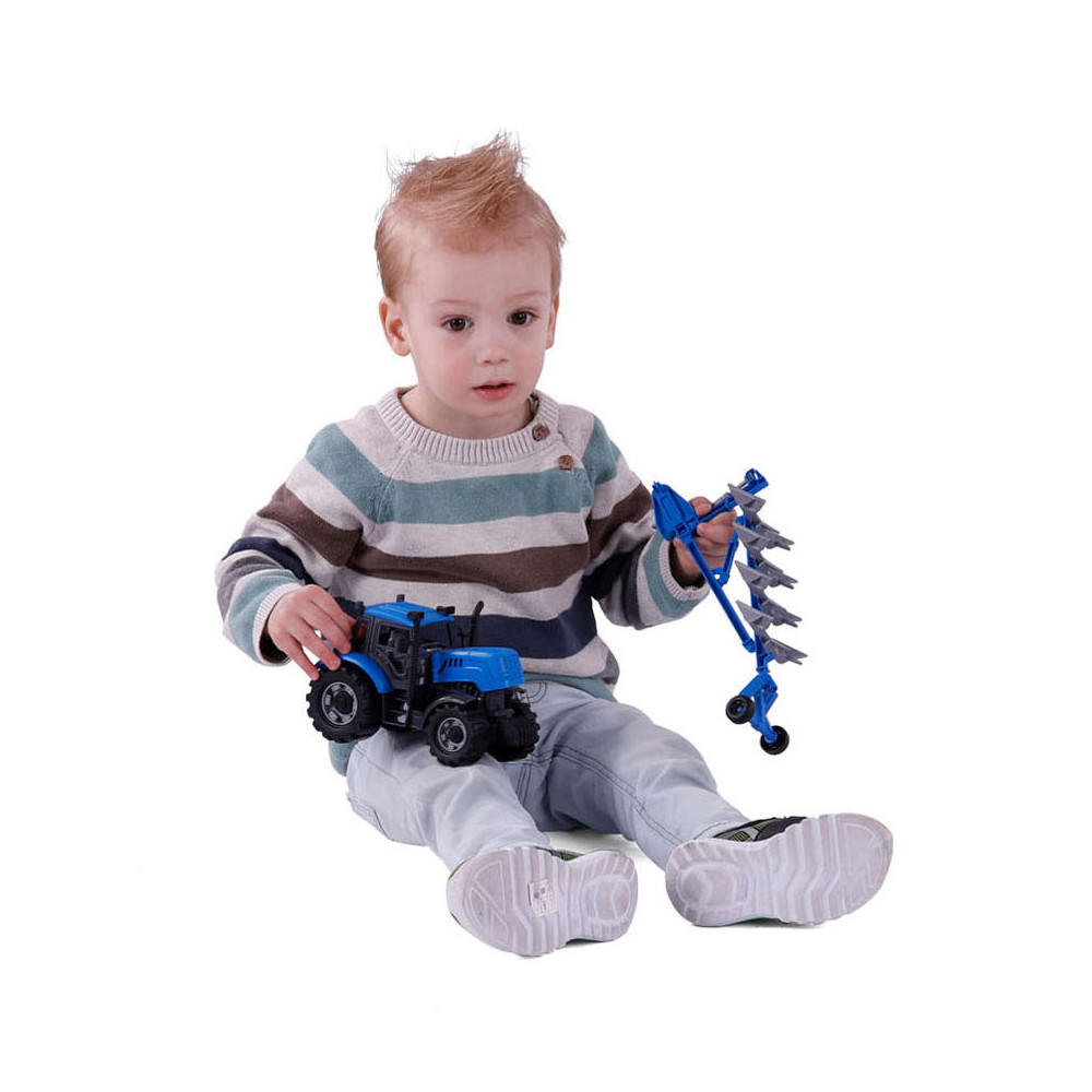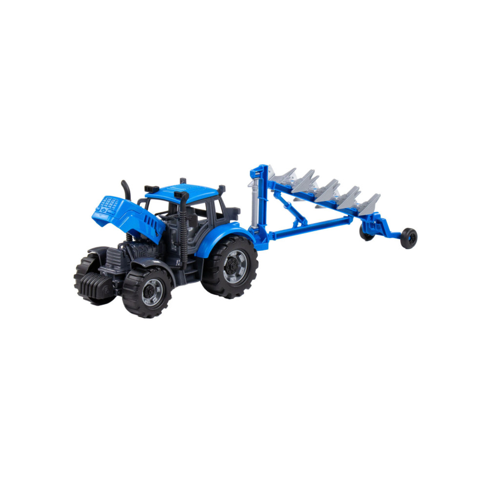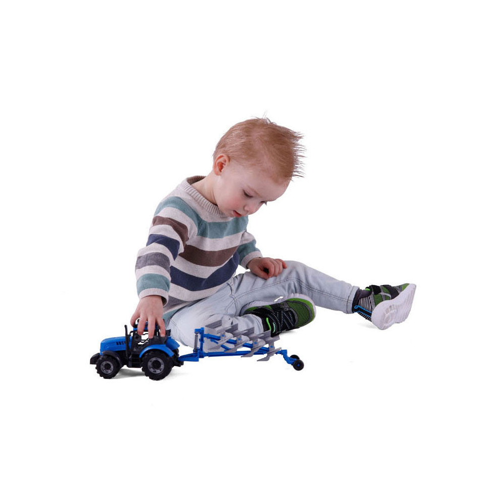 De Tractor met Ploeg op schaal 1:32! In een opvallende blauwe kleur! Ploegen ging nog nooit zo soepel en leuk. Laat de verbeelding van kinderen bloeien terwijl ze hun eigen boerderijverhalen creeren met deze gedetailleerde speelgoedtractor.