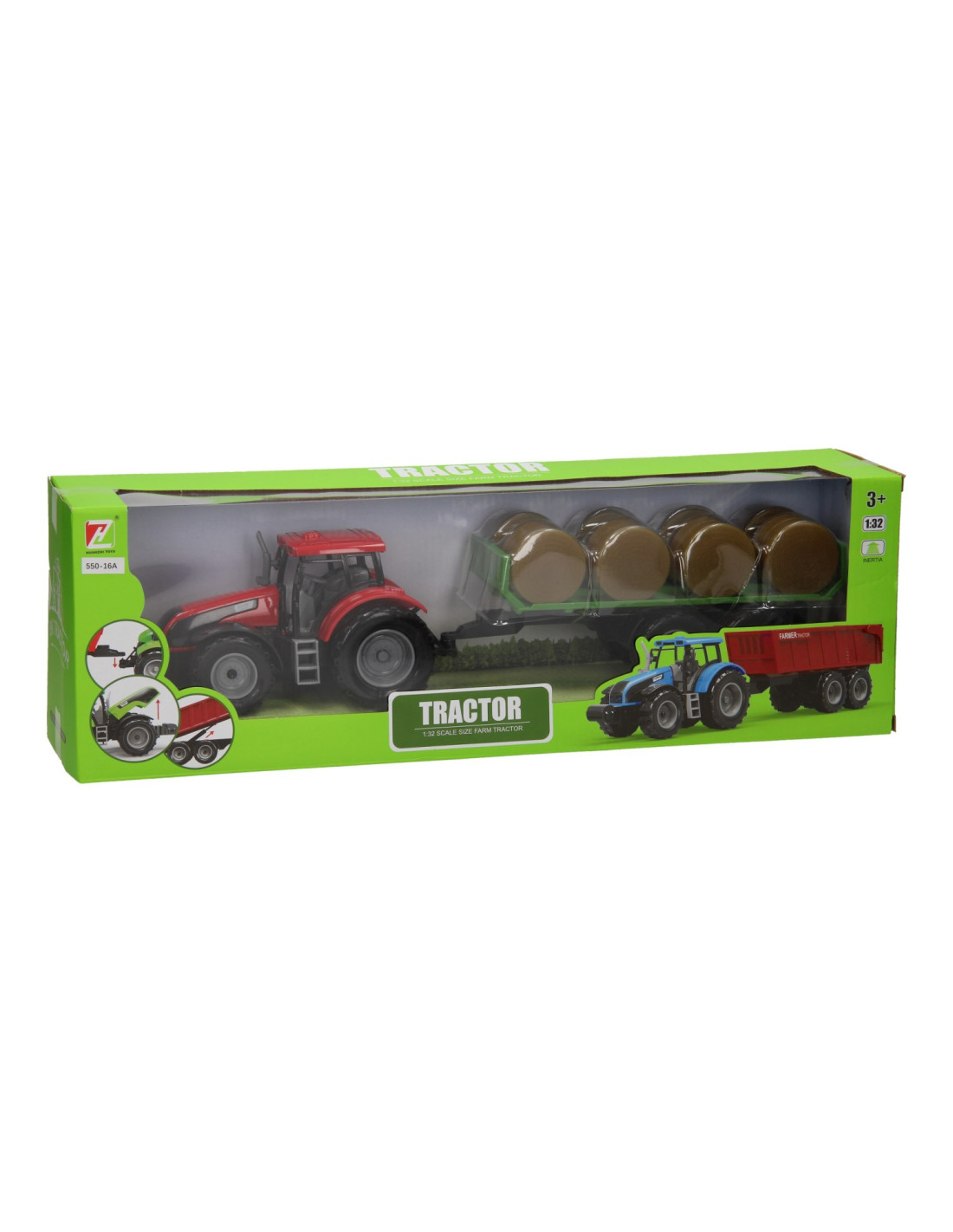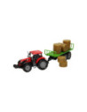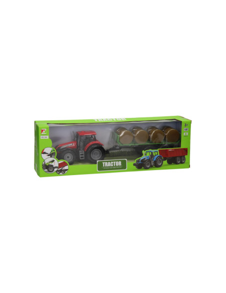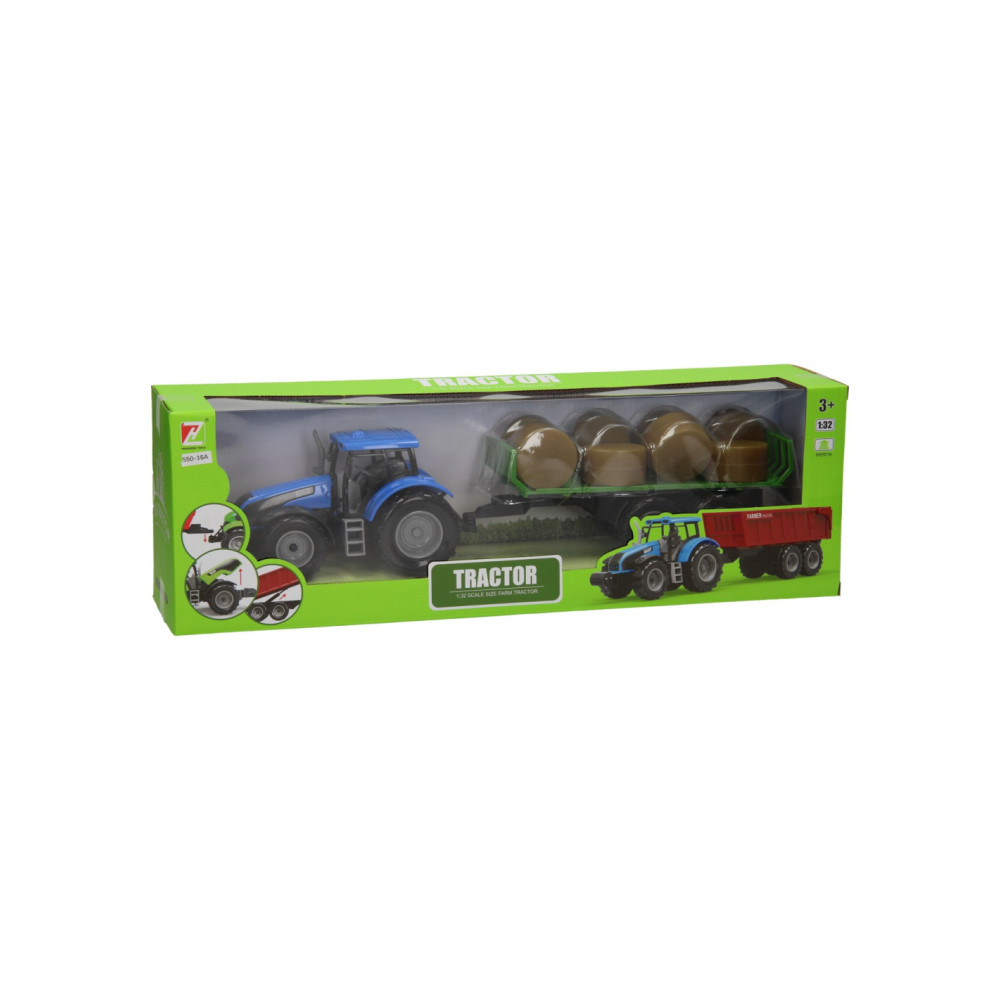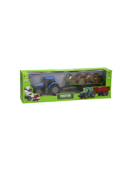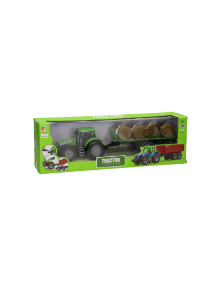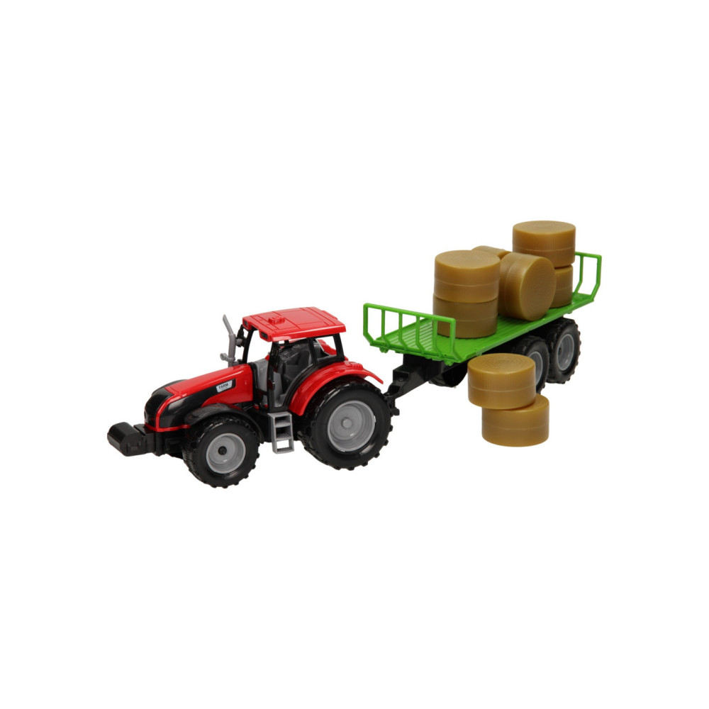 Deze kunststof tractor met groene aanhangwagen is speciaal ontworpen om ronde balen te vervoeren. De aanhanger bevat acht plastic hooibalen die er eenvoudig geladen kunnen worden. De balenwagen kan losgekoppeld worden van de tractor. De tractor is 20 x 20 x 10 cm en de aanhanger heeft een lengte van 24 cm. De totale lengte van de tractor met aanhanger is 44 cm. De motorkap van de tractor kan ook omhoog. Geschikt vanaf drie jaar. De tractor is verkrijgbaar in het groen, blauw en rood. Schaal 1:32, past bij de Kids Globe Stallen en Loodsen.