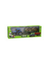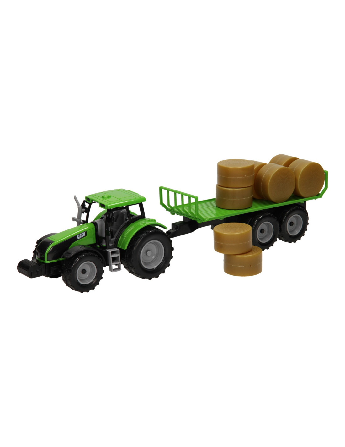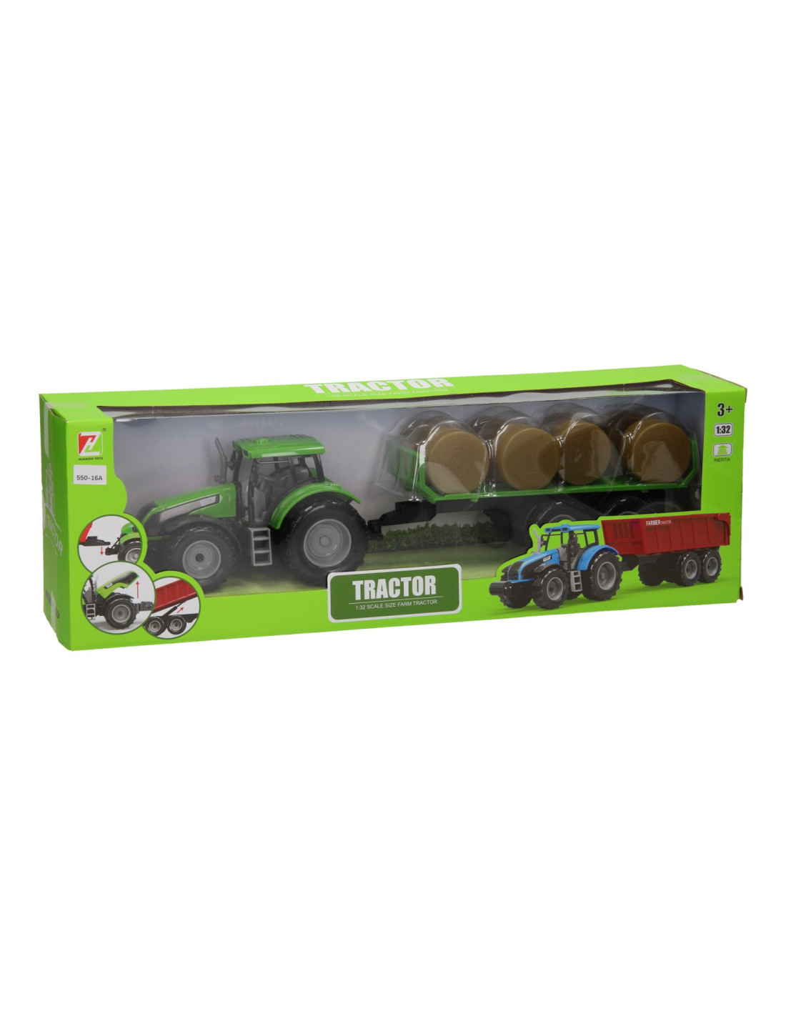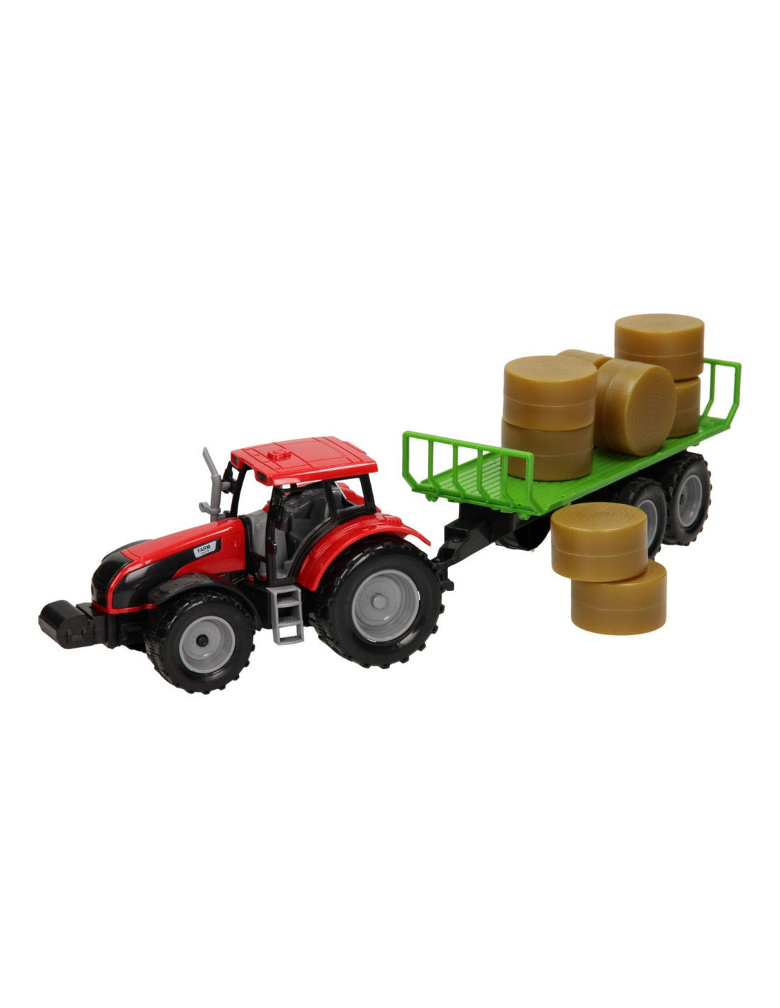 Deze kunststof tractor met groene aanhangwagen is speciaal ontworpen om ronde balen te vervoeren. De aanhanger bevat acht plastic hooibalen die er eenvoudig geladen kunnen worden. De balenwagen kan losgekoppeld worden van de tractor. De tractor is 20 x 20 x 10 cm en de aanhanger heeft een lengte van 24 cm. De totale lengte van de tractor met aanhanger is 44 cm. De motorkap van de tractor kan ook omhoog. Geschikt vanaf drie jaar. De tractor is verkrijgbaar in het groen, blauw en rood. Schaal 1:32, past bij de Kids Globe Stallen en Loodsen.