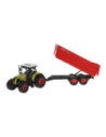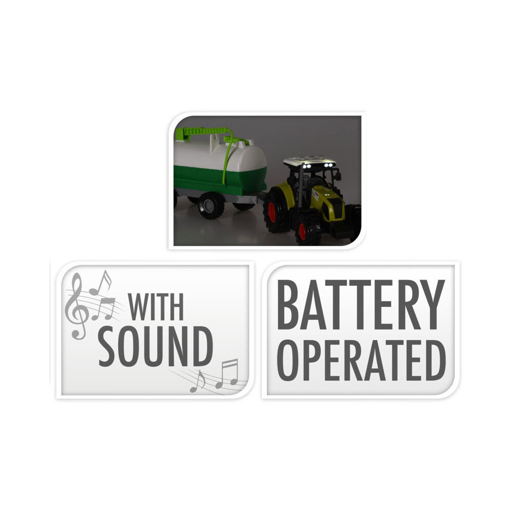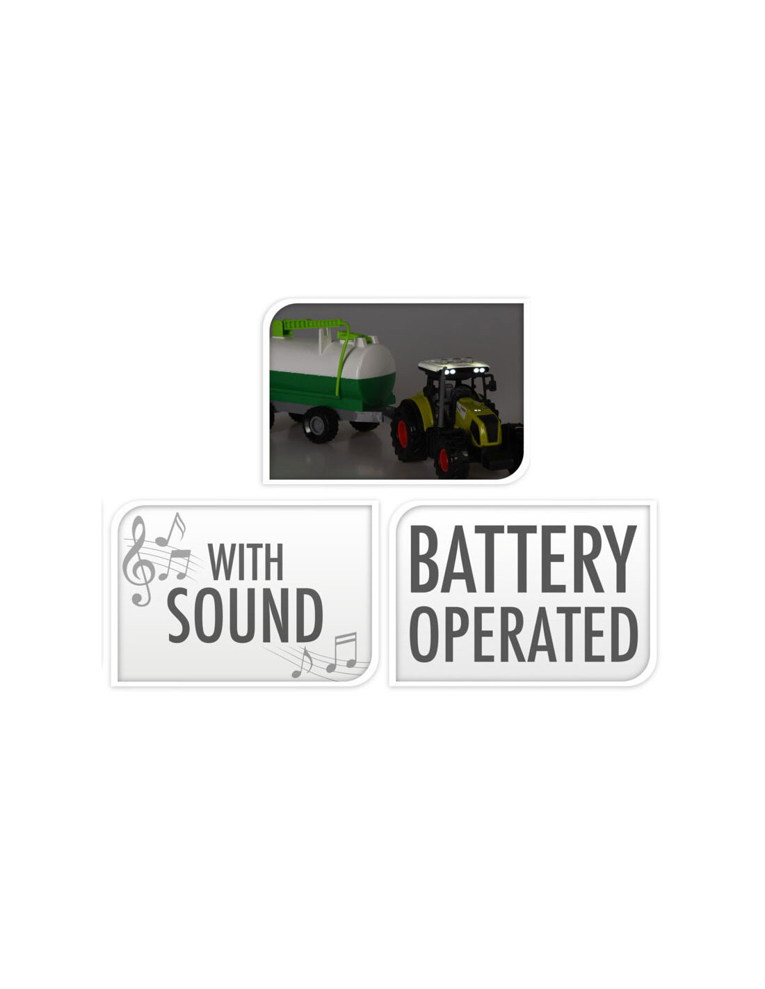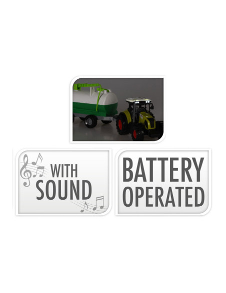 Speelgoedtractor met twee aanhangers (schudder en aanhanger met boomstammen). De tractor kan rijden dankzij een frictiesysteem en heeft licht- en geluidseffecten. De tractor is 13 centimeter lang en de aanhangers ca. 21 centimeter. 3 LR44-batterijen inbegrepen. Geschikt voor kinderen van 3 jaar en ouder.