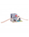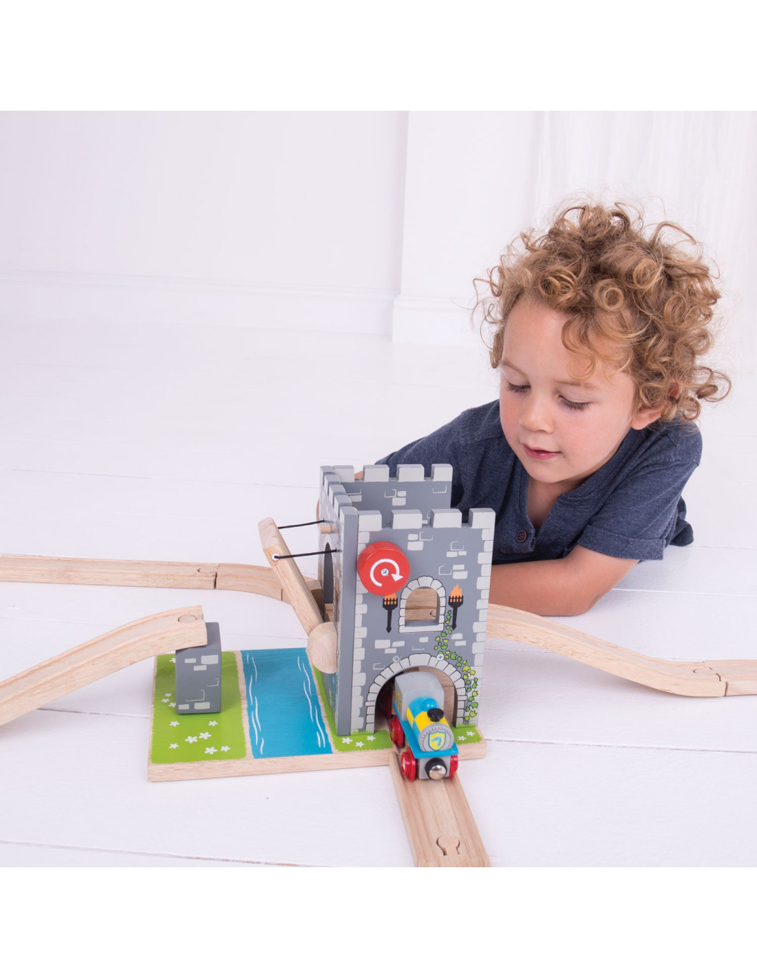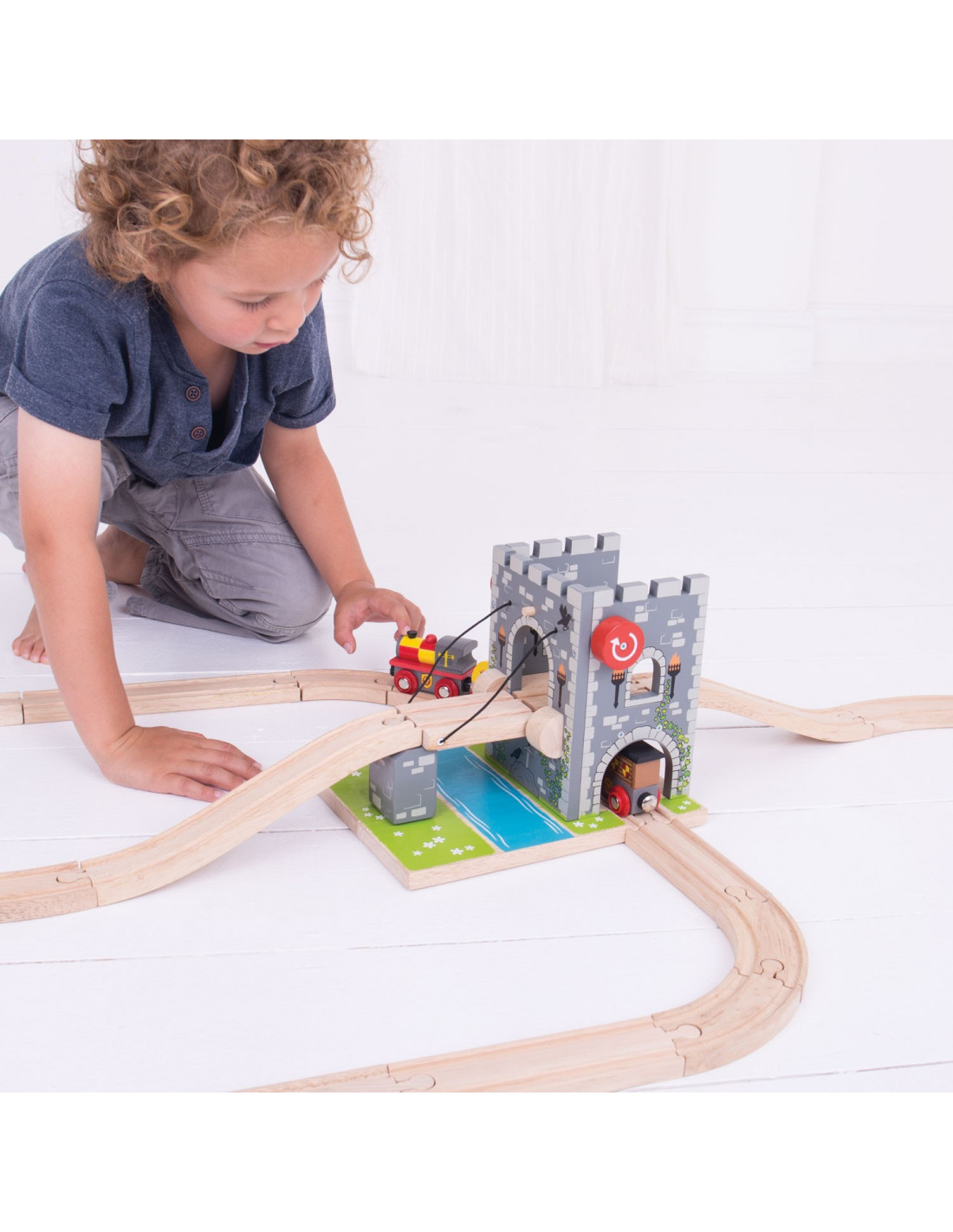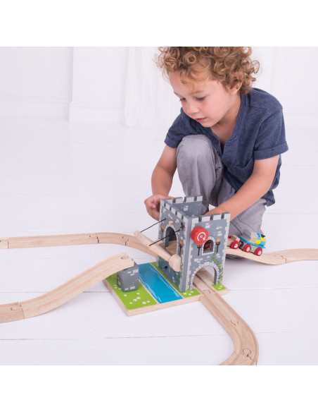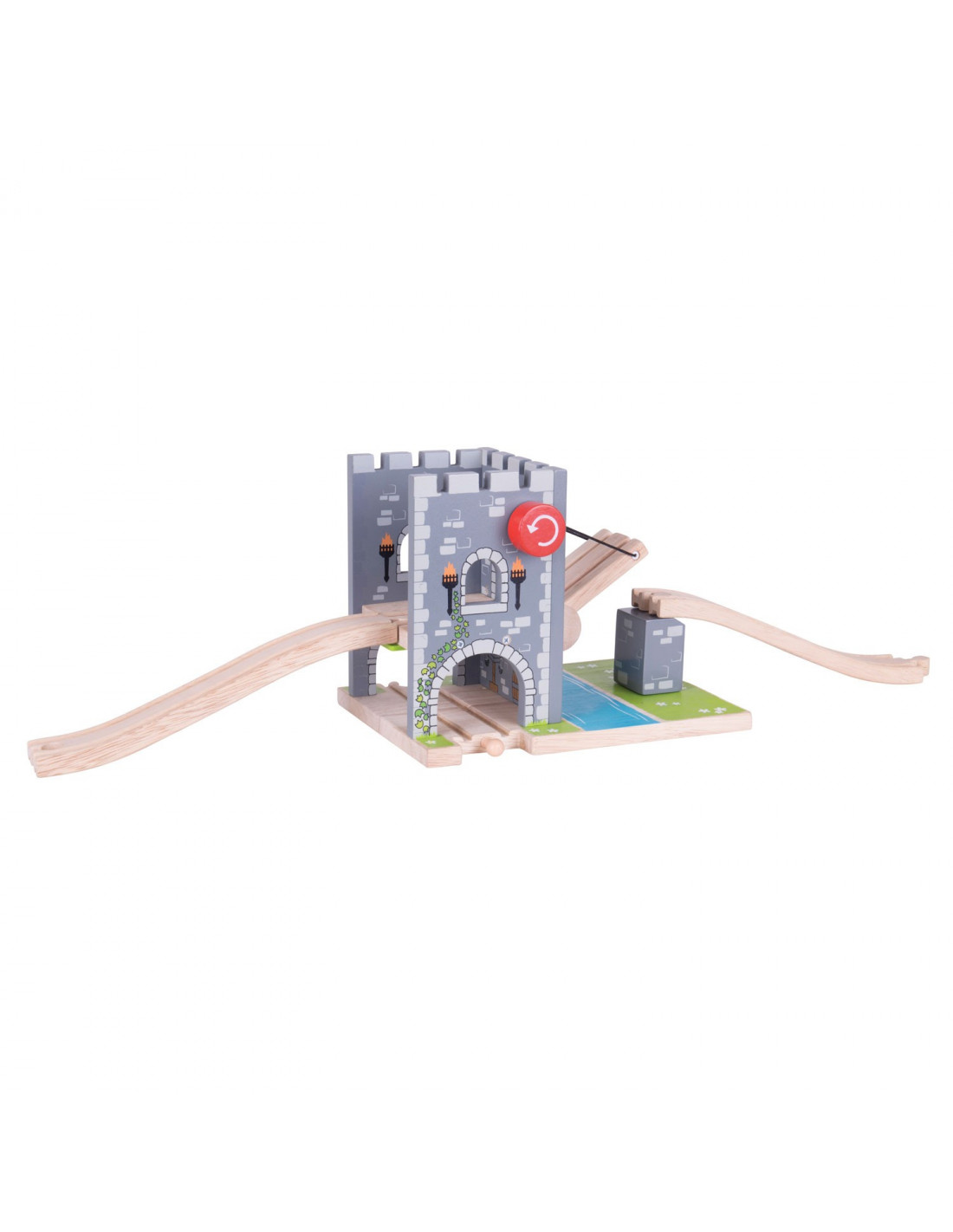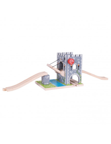 Breng je treinlandschap naar nieuwe hoogtes met deze houten ophaalbrug. De ophaalbrug lijkt net een echte kasteeltoren met een bijbehorende gracht. Draai aan de knop en zie hoe de brug aan de kabels naar beneden zakt.