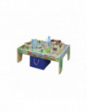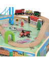Ga er lekker voor zitten bij jouw eigen Houten Treinbaan op Speeltafel! Deze speelset bestaat uit 50 onderdelen: een speeltafel, verschillende soorten rails, 2 tunnels, een brug, locomotief, 2 wagons, voertuigen, gebouwen, dieren, bomen, speelfiguren en een opbergdoos met handvaten om alle onderdelen in te bewaren. De speeltafel is prachtig beschilderd met treinen en een plattegrond om op te spelen met een weg, water en gebouwen. De Houten Treinbaan op Speeltafel sluit aan bij de meeste andere houten merken railsystemen.