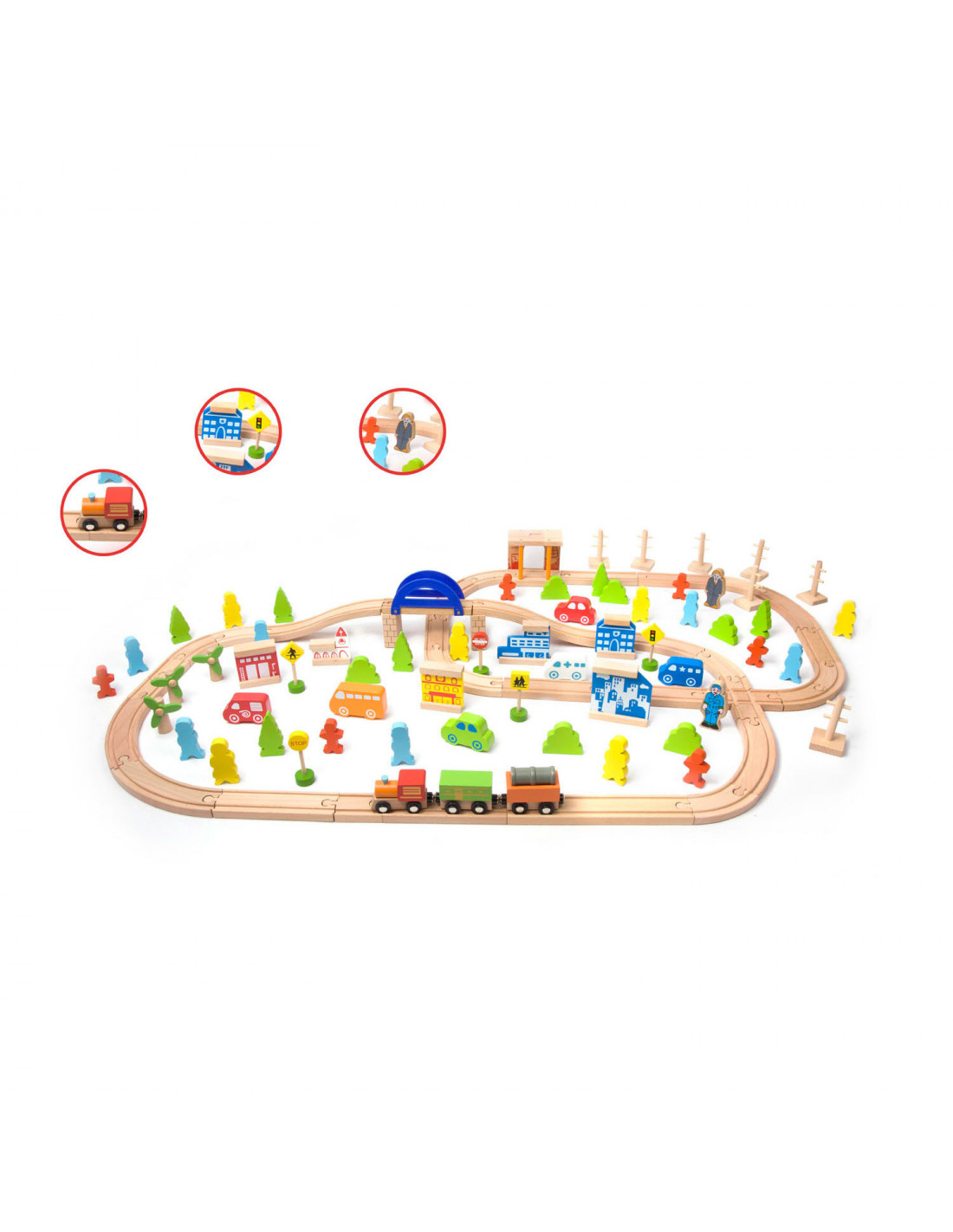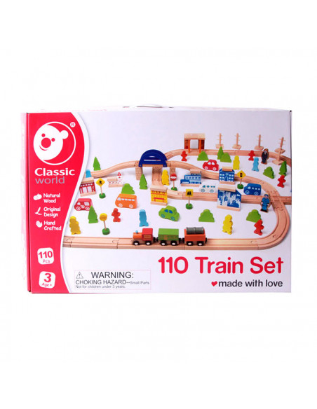 De treinset van het merk Classic Wold is gemaakt van robuust en stevig hout en bestaat uit 110 onderdelen. De Classic World treinset is een erg complete set en wordt geleverd inclusief de accessoires zoals de treintjes, bomen, brug, gebouwen, verkeersborden en speelfiguurtjes.