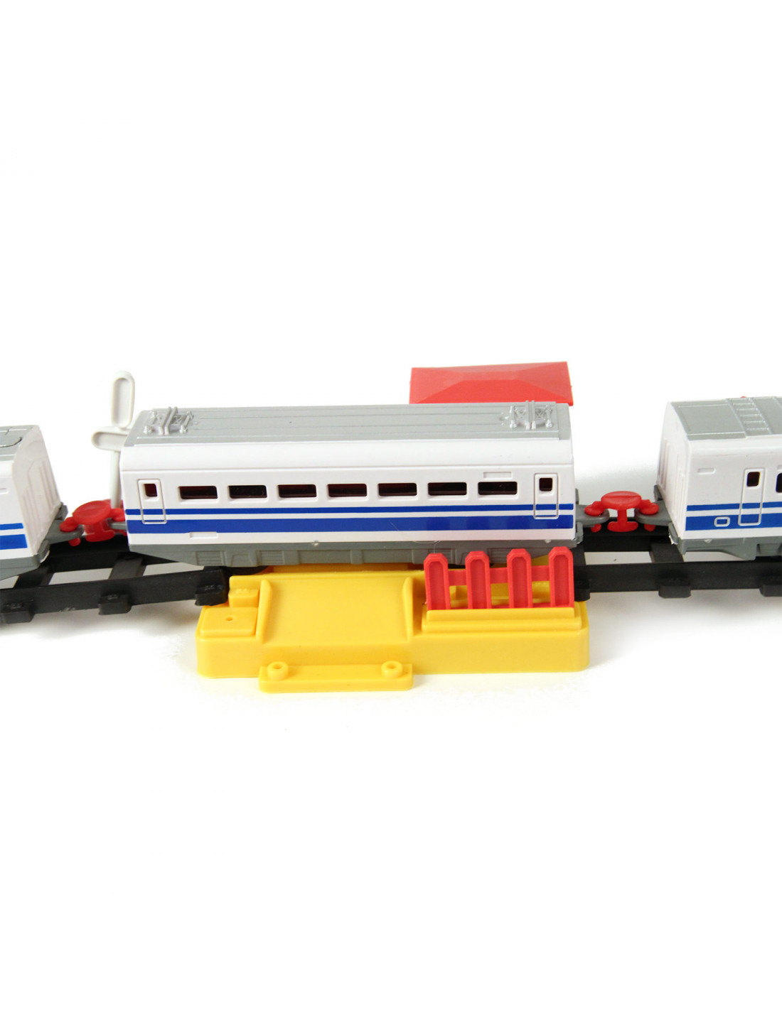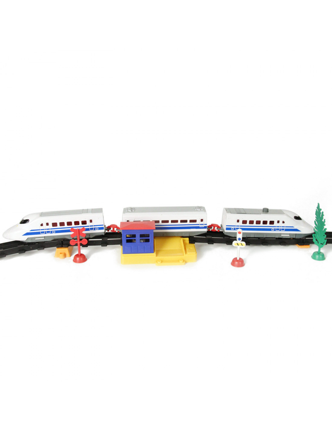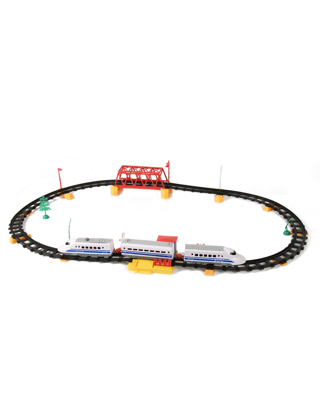 Bij deze 50-delige hogesnelheidstrein set vind je een 3-delige elektrische trein met 2 wagons, 12 railstukken, een brug, een station en verschillende seinen en bomen. Batterijen niet inbegrepen.