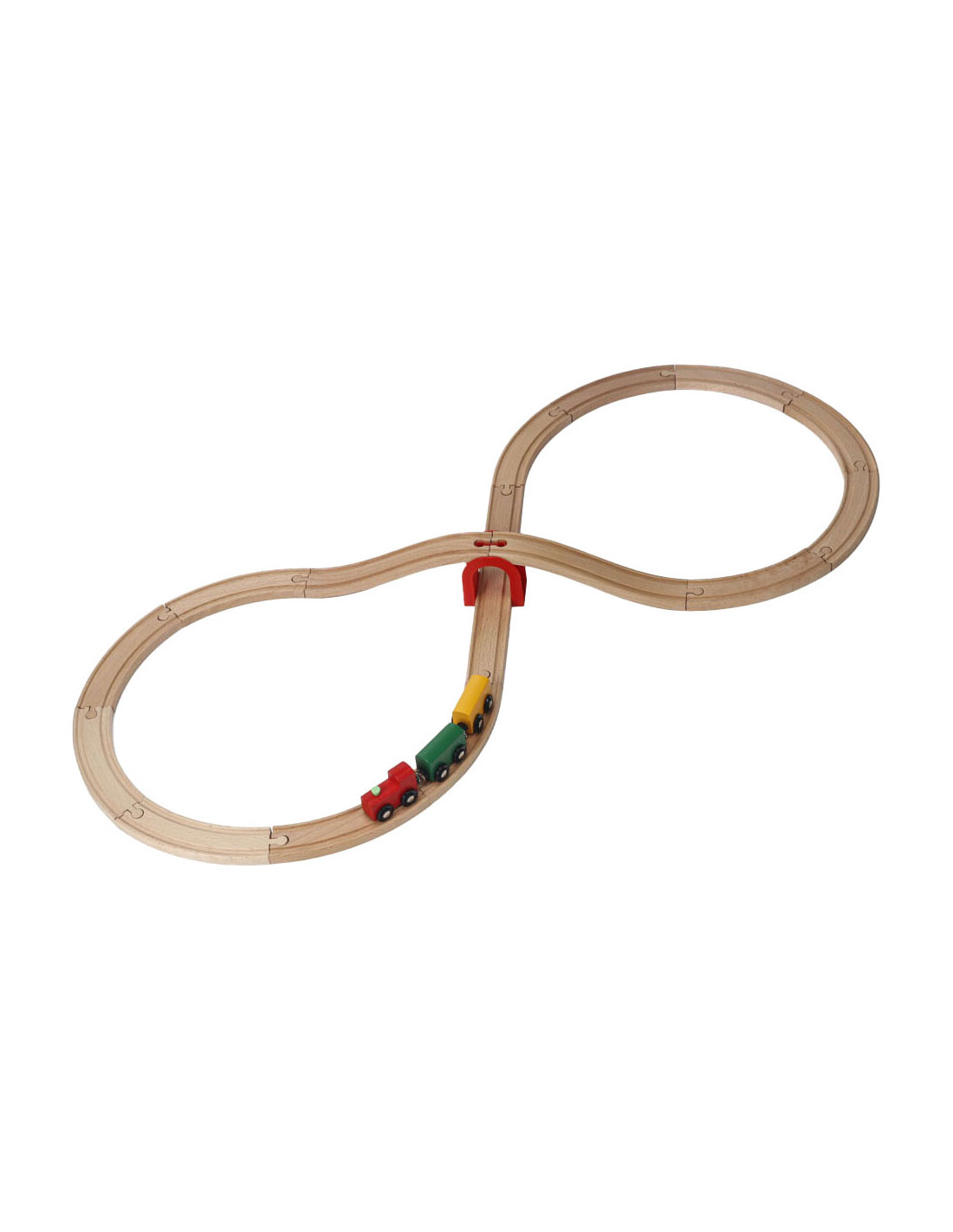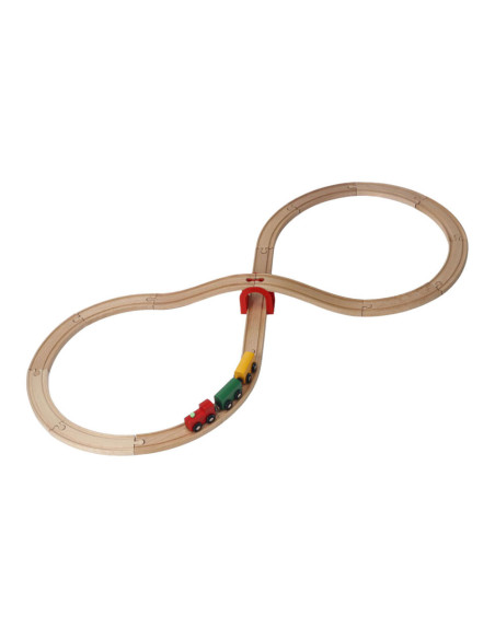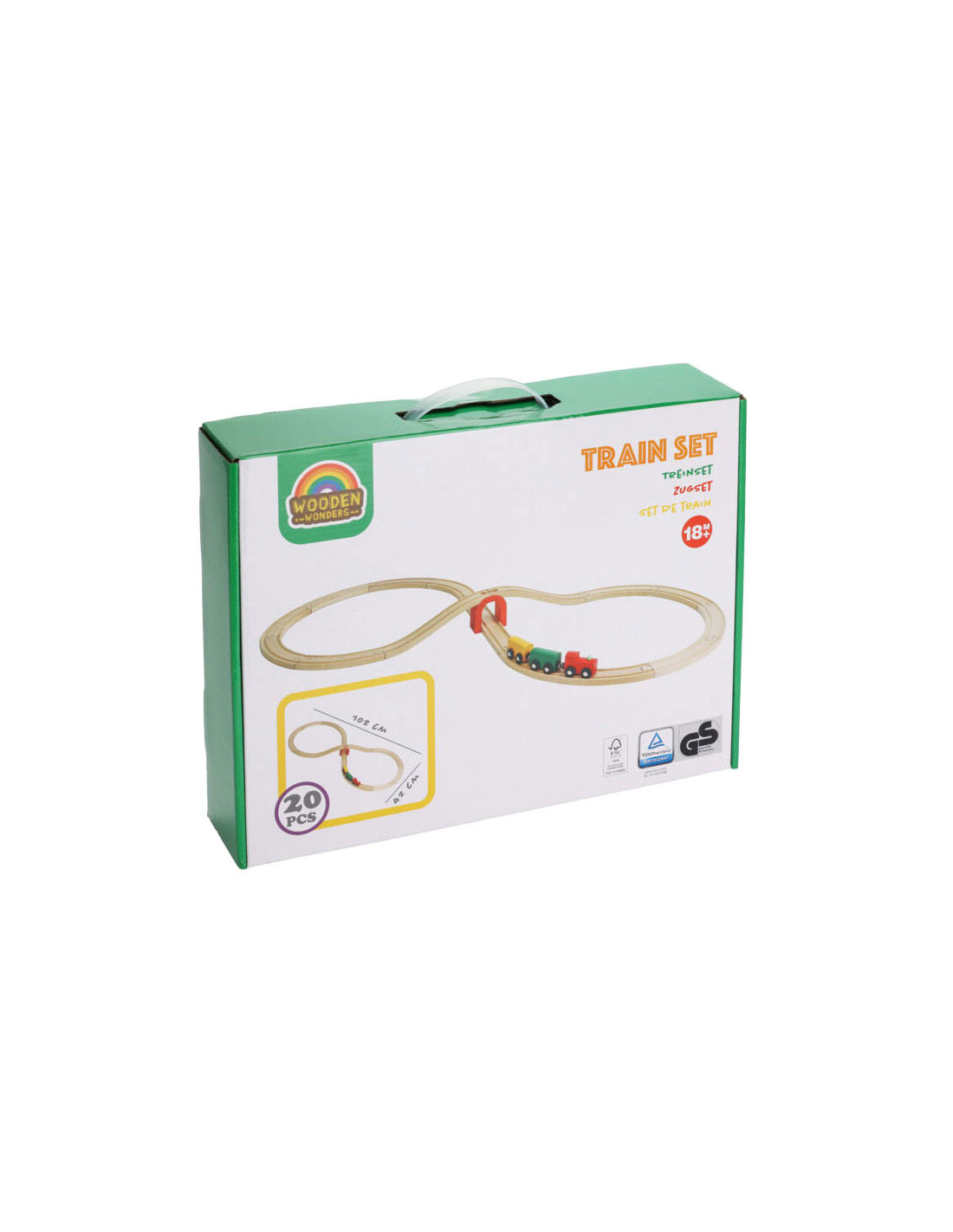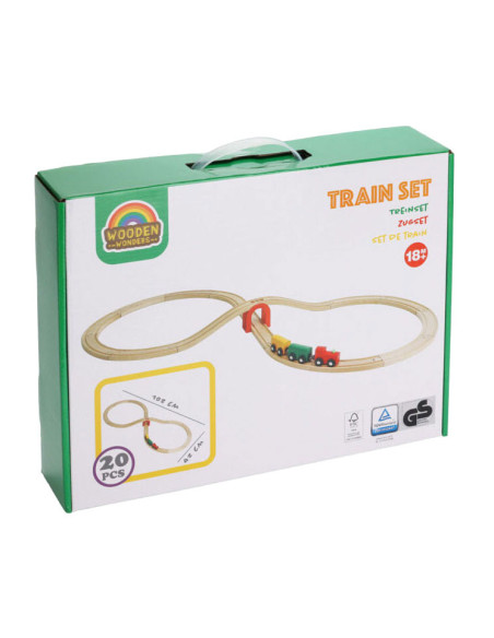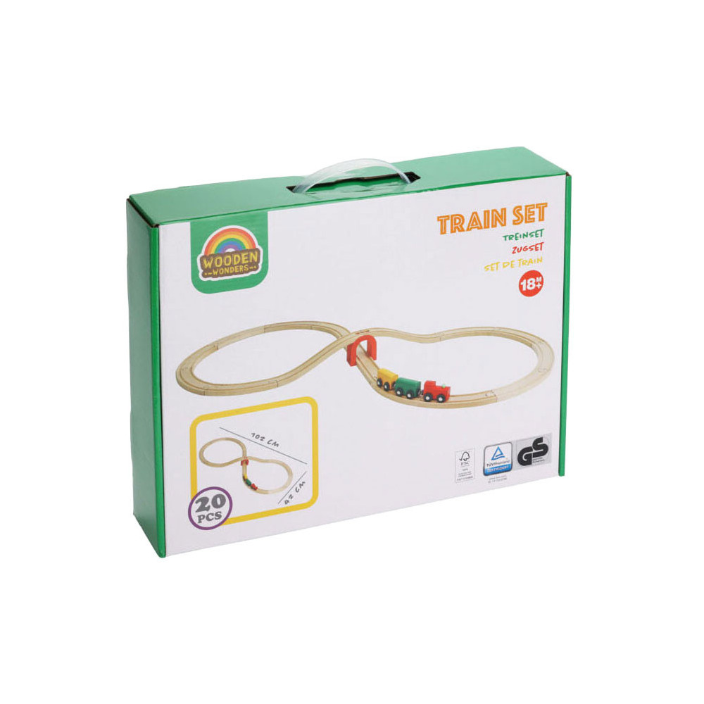 Houten treinset met 20 onderdelen, waaronder 1 locomotief en 2 wagonnetjes. Afmetingen: 102 x 42 cm. Geschikt voor kinderen vanaf 18 maanden oud.