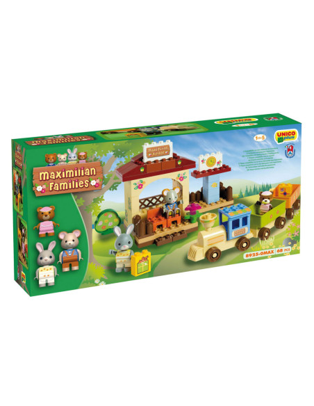 68-delige Maximilian Families Unico village treinstation met een trein met 2 wagons en een platform waar de familie op de trein kan wachten. Inclusief 3 poppetjes.