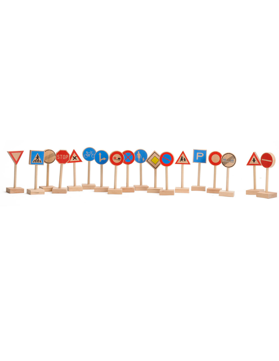 Set van 18 houten verkeersborden. Met onder andere een stopbord, verplicht fietspad, niet parkeren, zebrapad, voetgangerspad en een voorrangsweg.