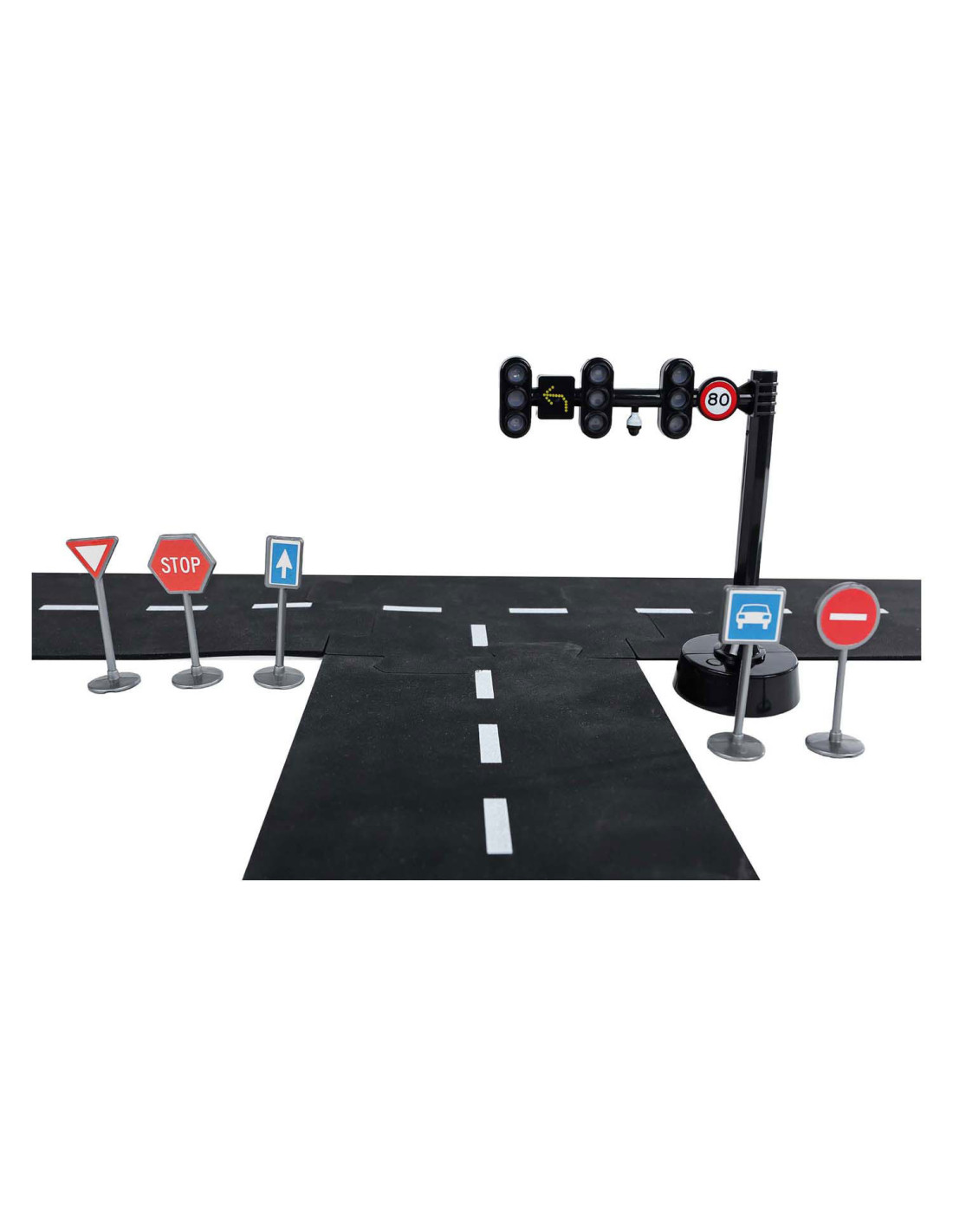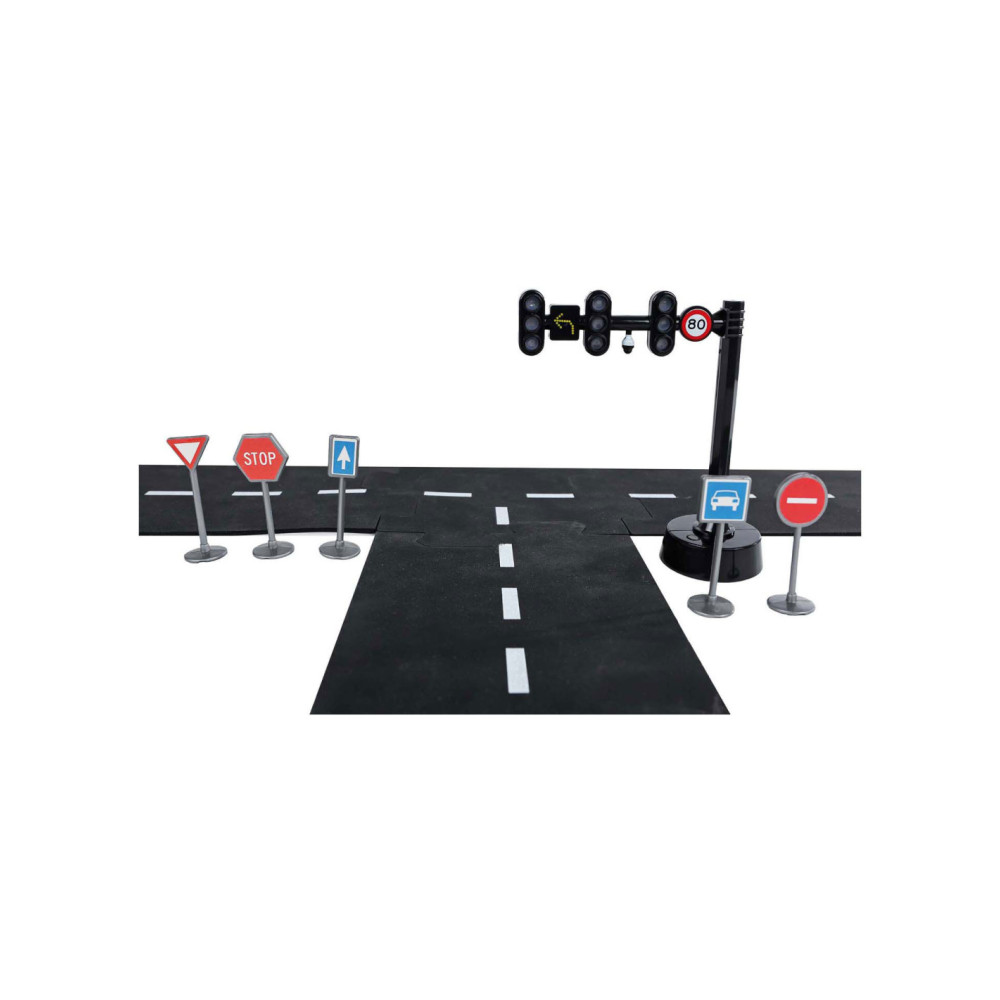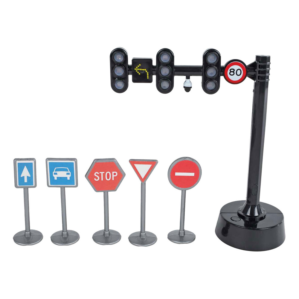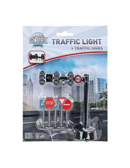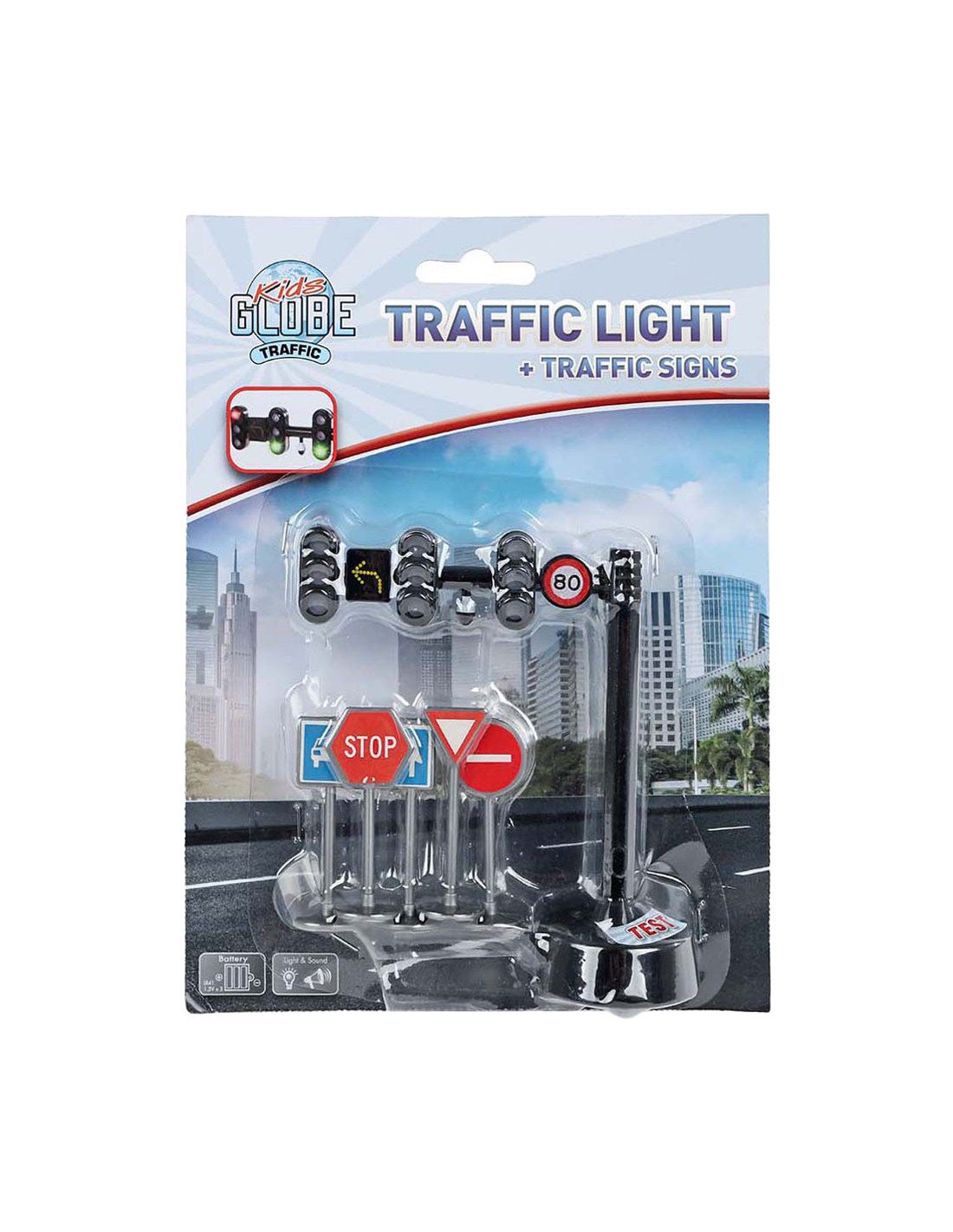 Kids Globe verkeerslicht van 11,5 cm met 3 lichten en 5 verkeersborden. Inclusief 3 LR44-batterijen. Geschikt voor kinderen vanaf 3 jaar oud.