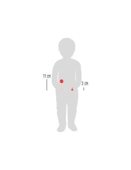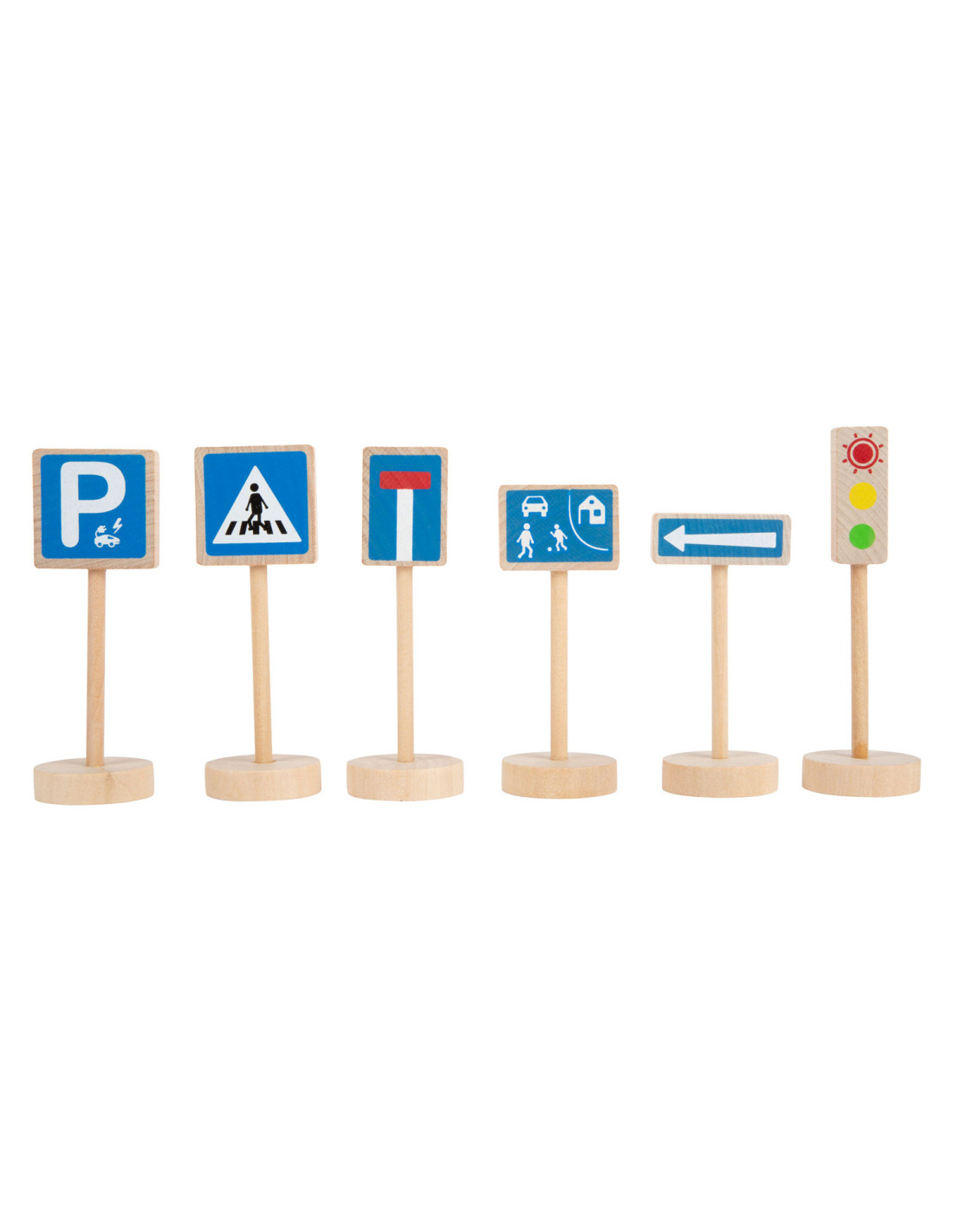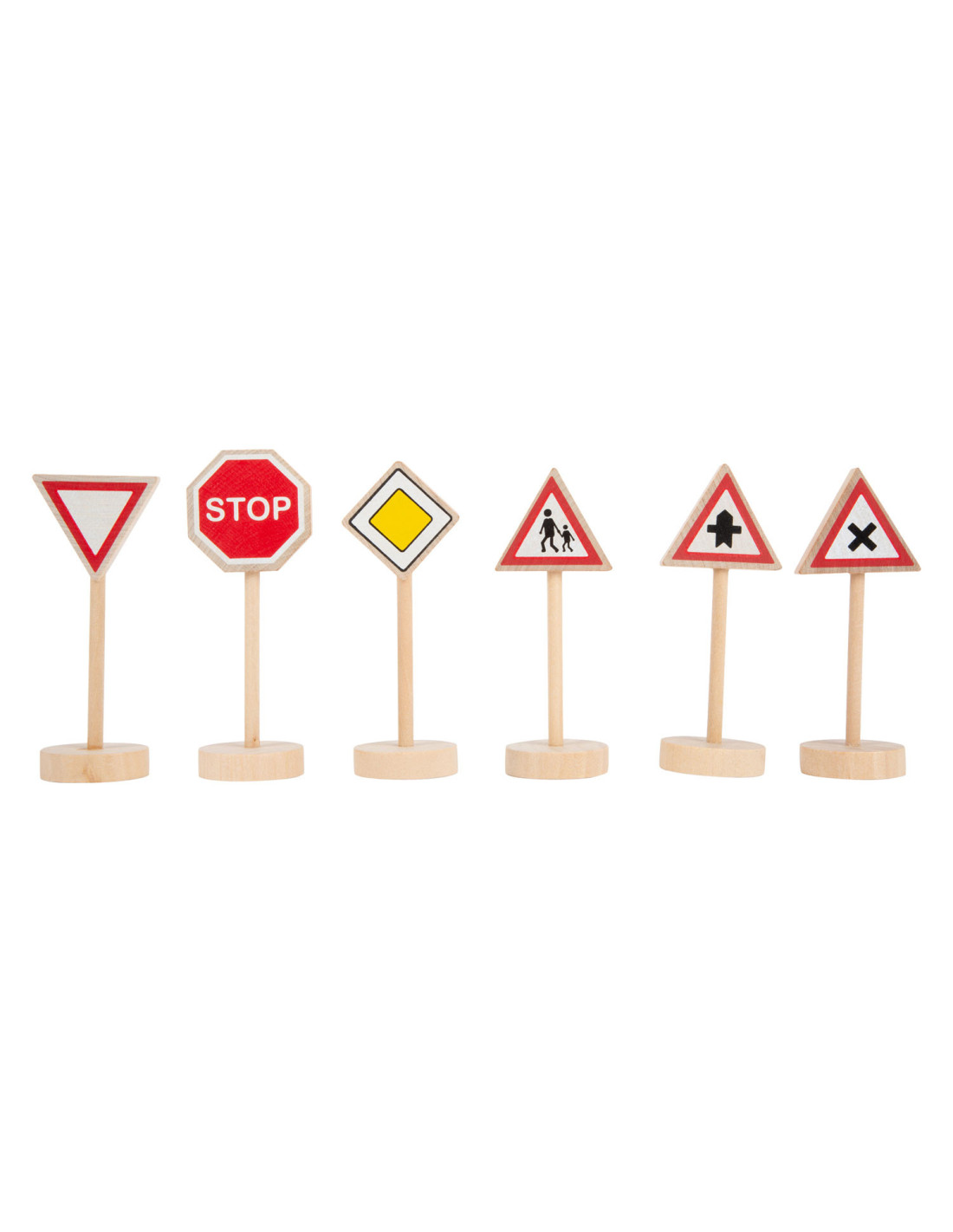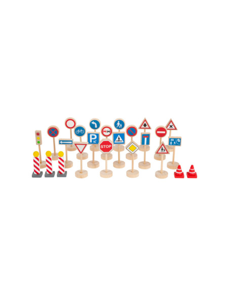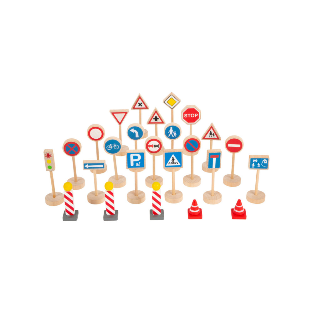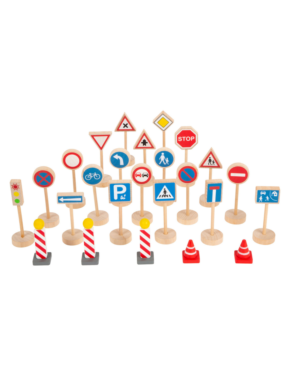 Veiligheid op de weg! Deze internationale verkeersborden van hout brengen orde in het weg- en spoorverkeer in de kinderkamer. De realistisch vormgegeven straatnaamborden met stevige voet regelen niet alleen het verkeer in de speelwereld - ze geven ook kennis over belangrijke verkeersveiligheidsregels in de zin van een vroege verkeerseducatie. Wordt geleverd met een dubbelzijdig verkeerslicht dat een rode en een groene fase laat zien. Wie weet hoe een bord “Stop” eruit ziet? Internationale verkeersborden en bouwblokkades zijn de ideale toevoegingen voor houten speelgoedtreinen, speelgoedvoertuigen en parkeergarages!