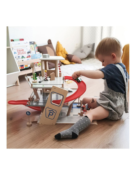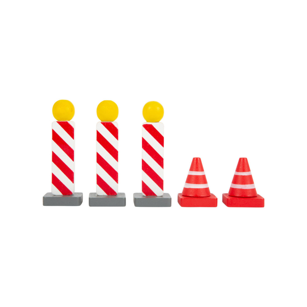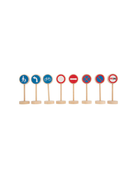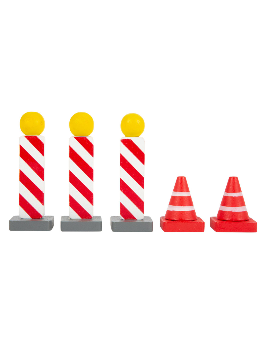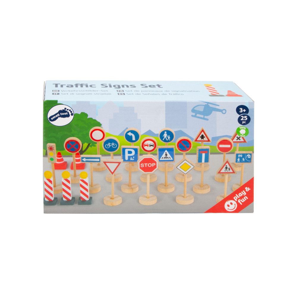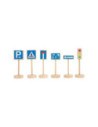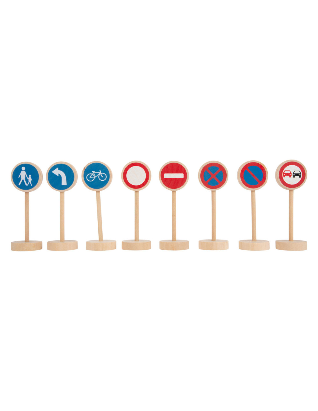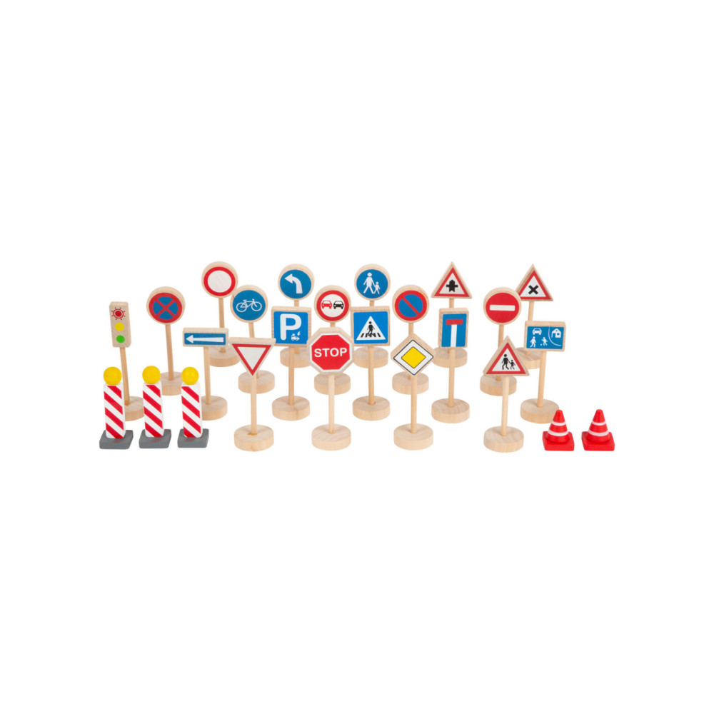 Veiligheid op de weg! Deze internationale verkeersborden van hout brengen orde in het weg- en spoorverkeer in de kinderkamer. De realistisch vormgegeven straatnaamborden met stevige voet regelen niet alleen het verkeer in de speelwereld - ze geven ook kennis over belangrijke verkeersveiligheidsregels in de zin van een vroege verkeerseducatie. Wordt geleverd met een dubbelzijdig verkeerslicht dat een rode en een groene fase laat zien. Wie weet hoe een bord “Stop” eruit ziet? Internationale verkeersborden en bouwblokkades zijn de ideale toevoegingen voor houten speelgoedtreinen, speelgoedvoertuigen en parkeergarages!