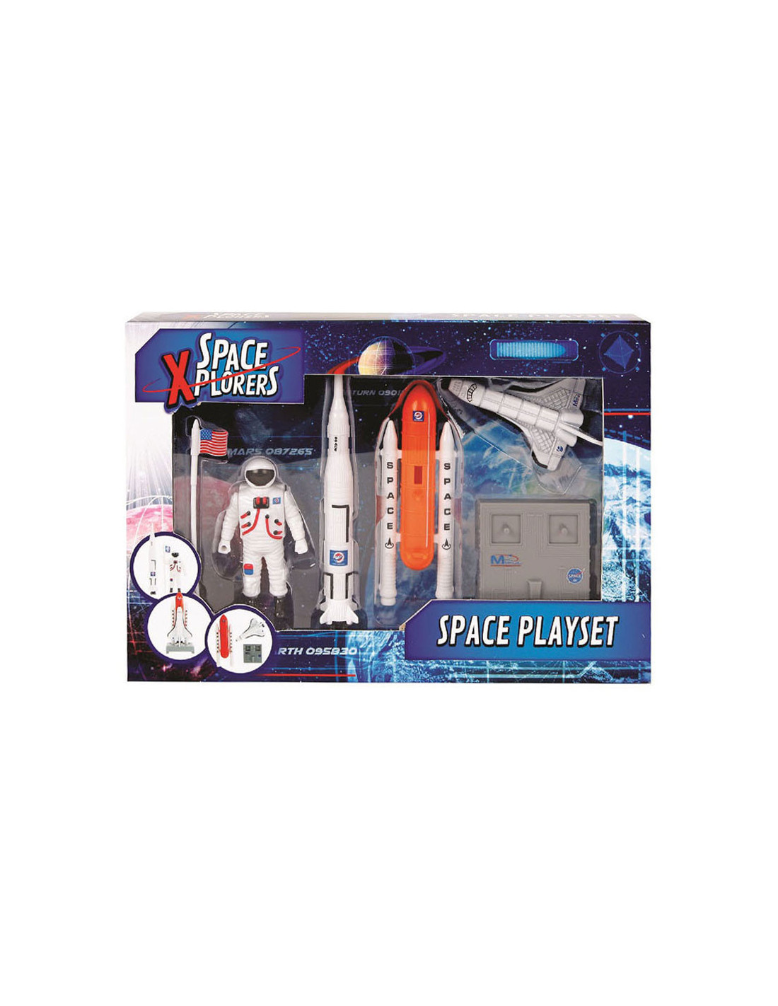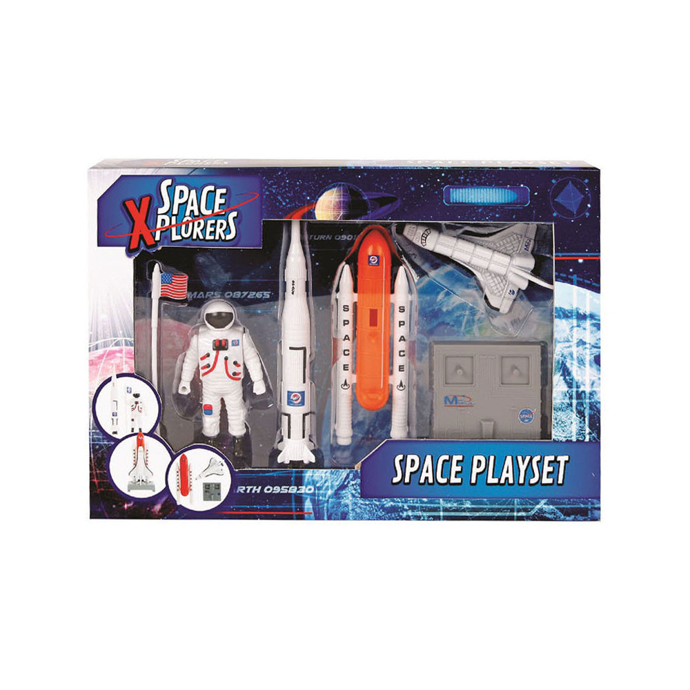 Space Xplorers 6-delige ruimtevaart speelset met een astronaut, Amerikaanse vlag en verschillende raketten.