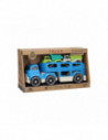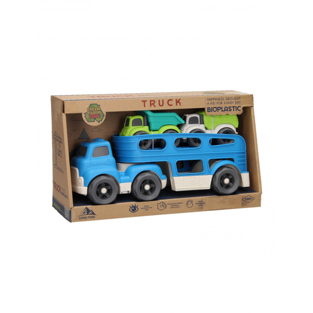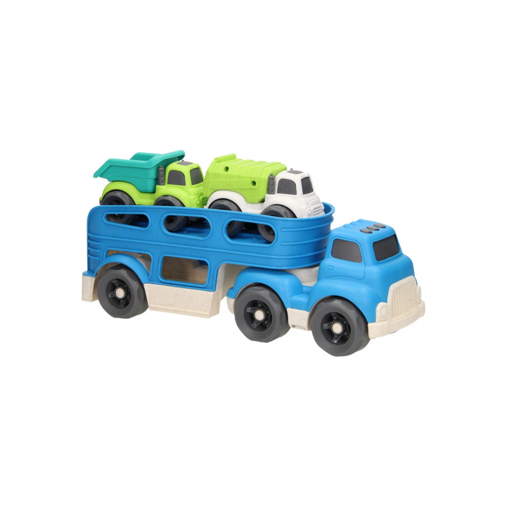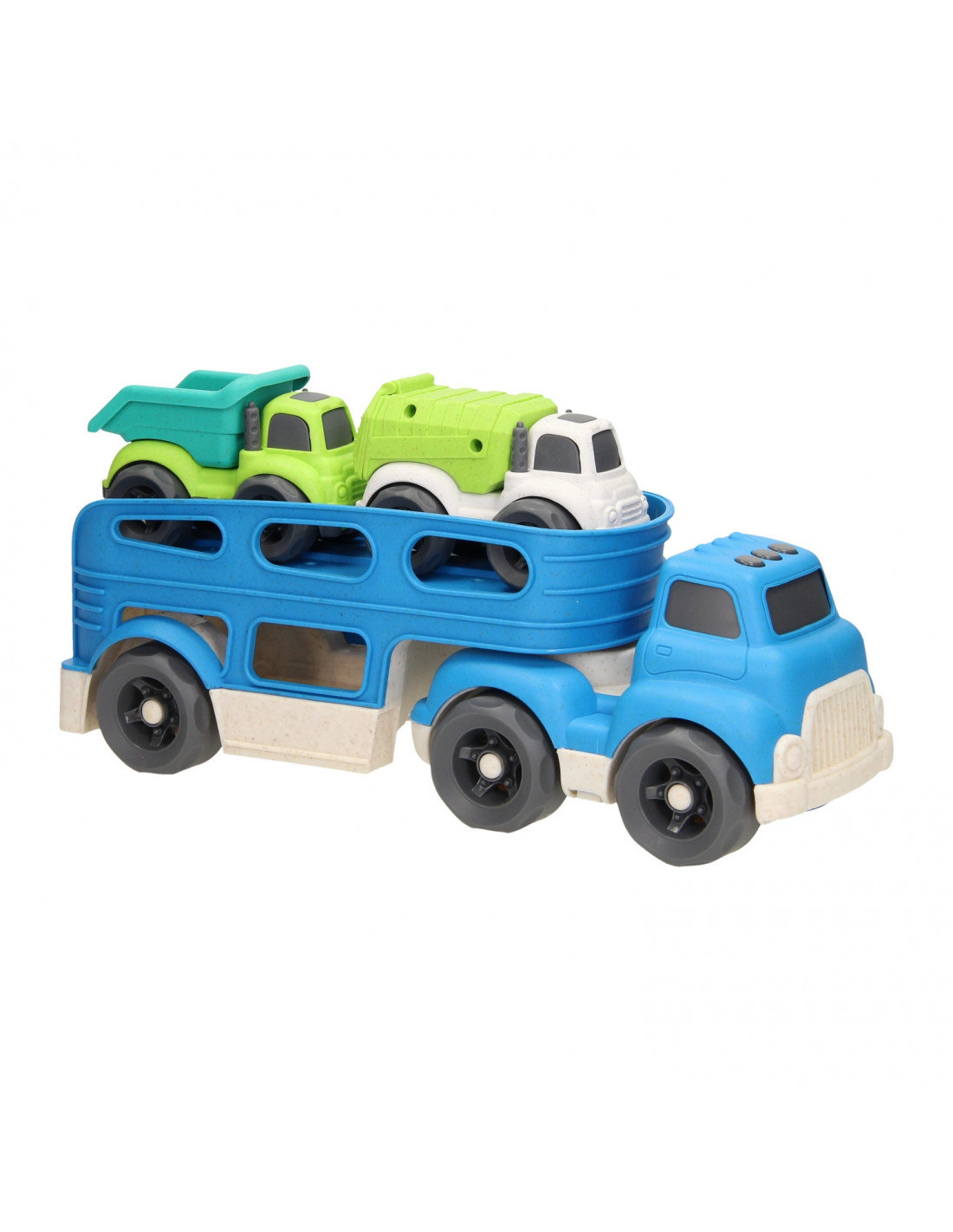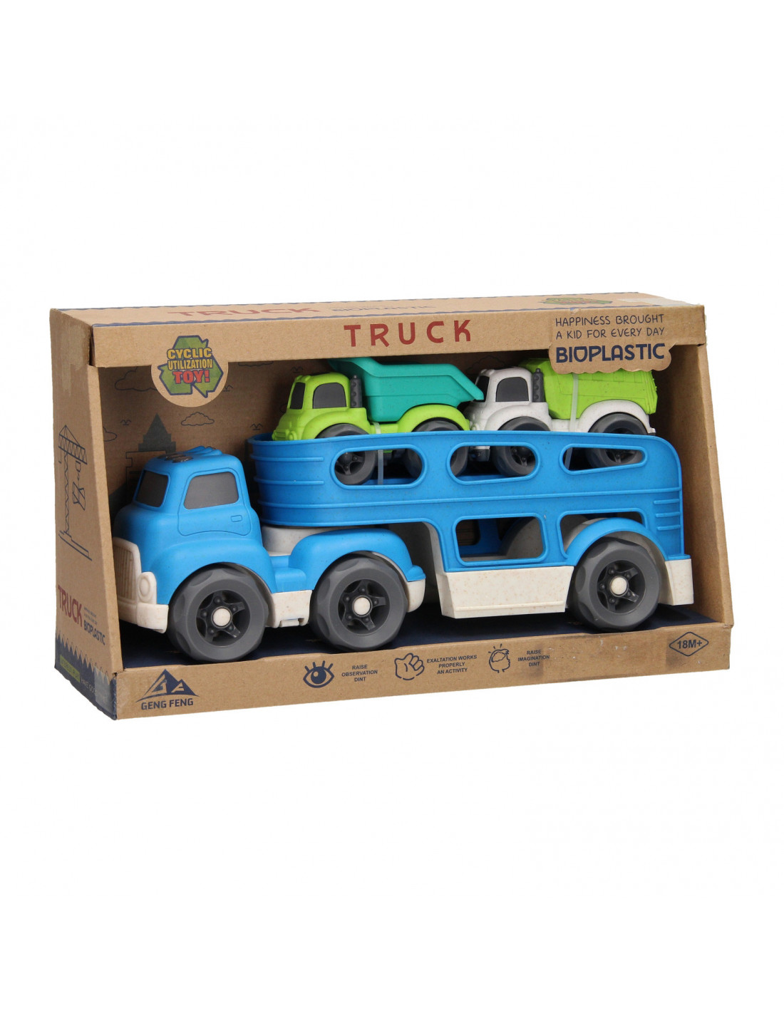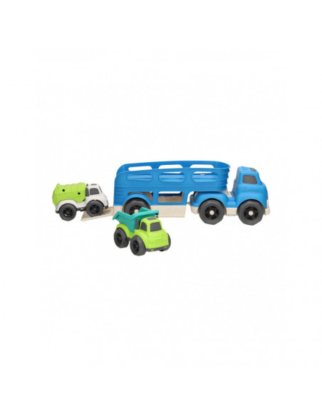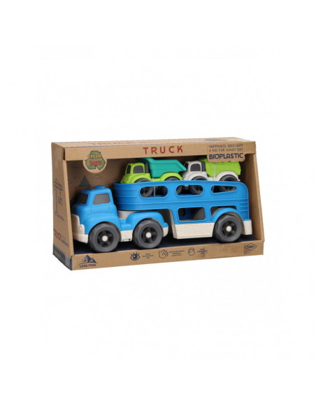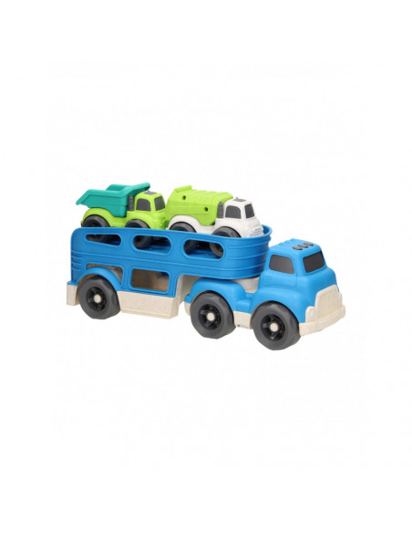 Blauwe vrachtwagen en 2 auto's die de vrachtwagen kan transporteren. De vrachtwagen en auto's zijn gemaakt van gerecycled plastic. De vrachtwagen is 30 bij 10 bij 10 centimeter en de auto's zijn 8 centimeter lang. Geschikt van 18 maanden tot 4 jaar.