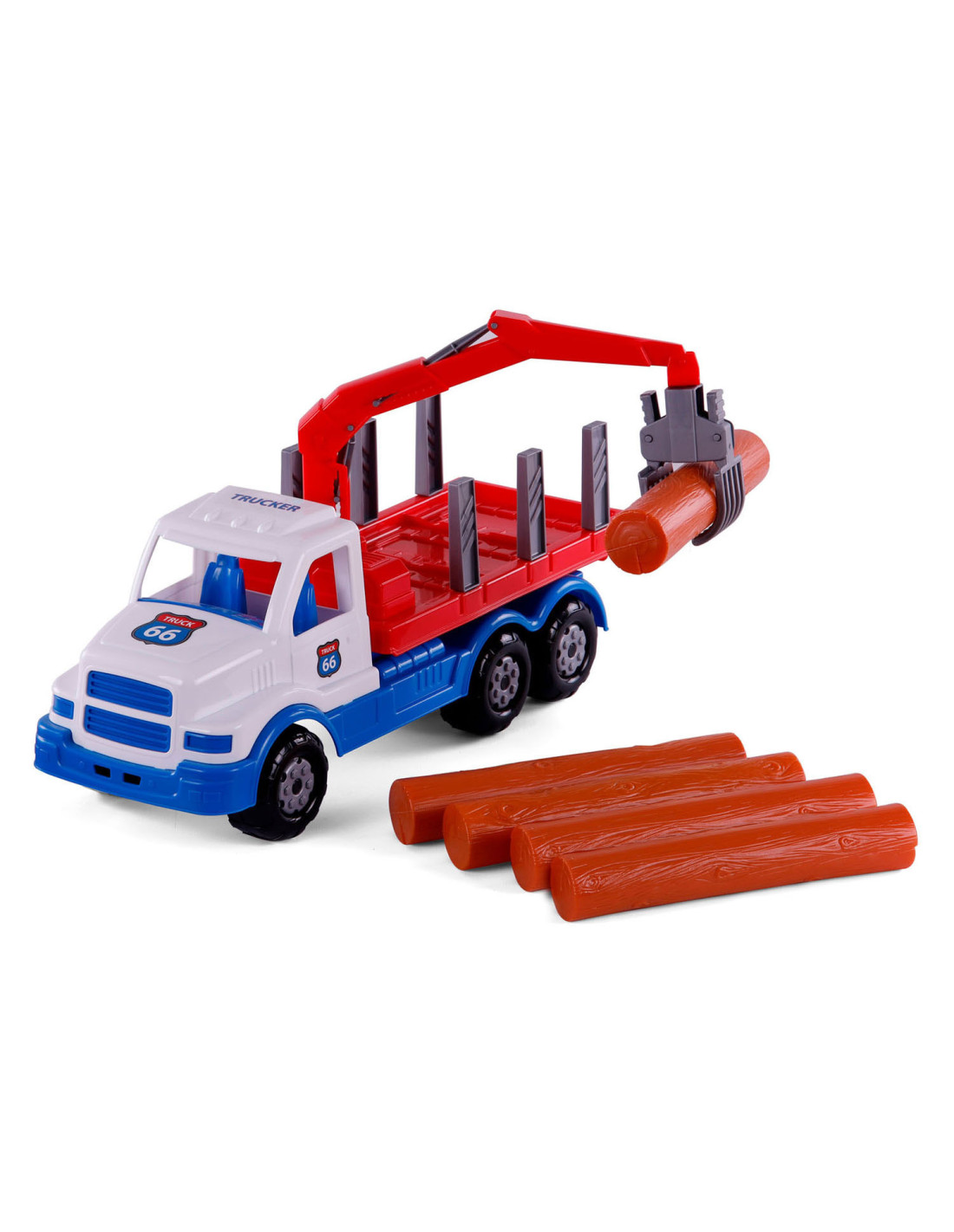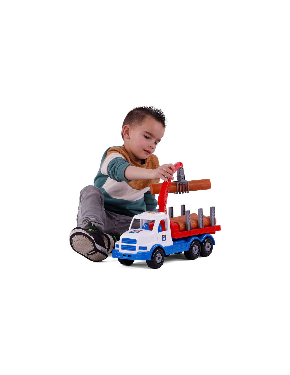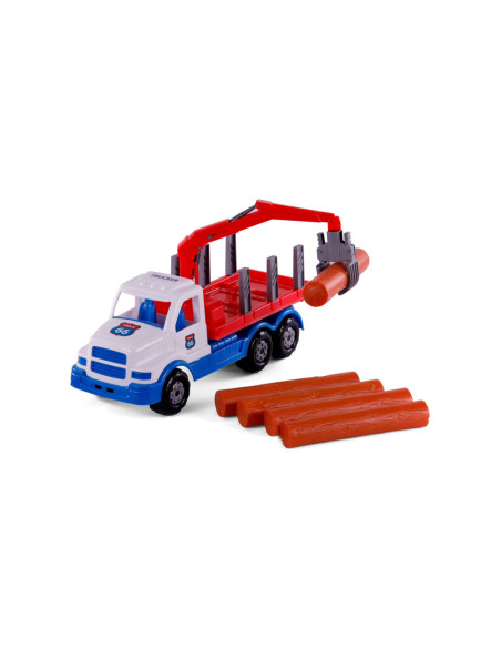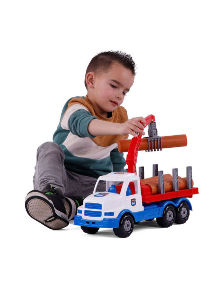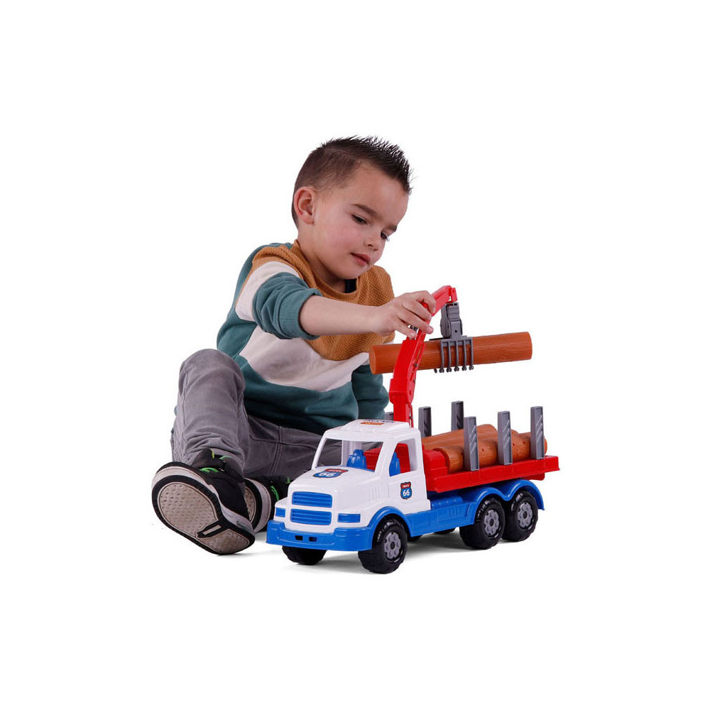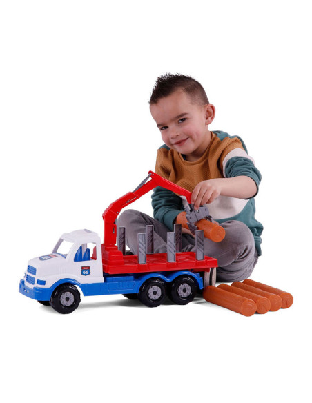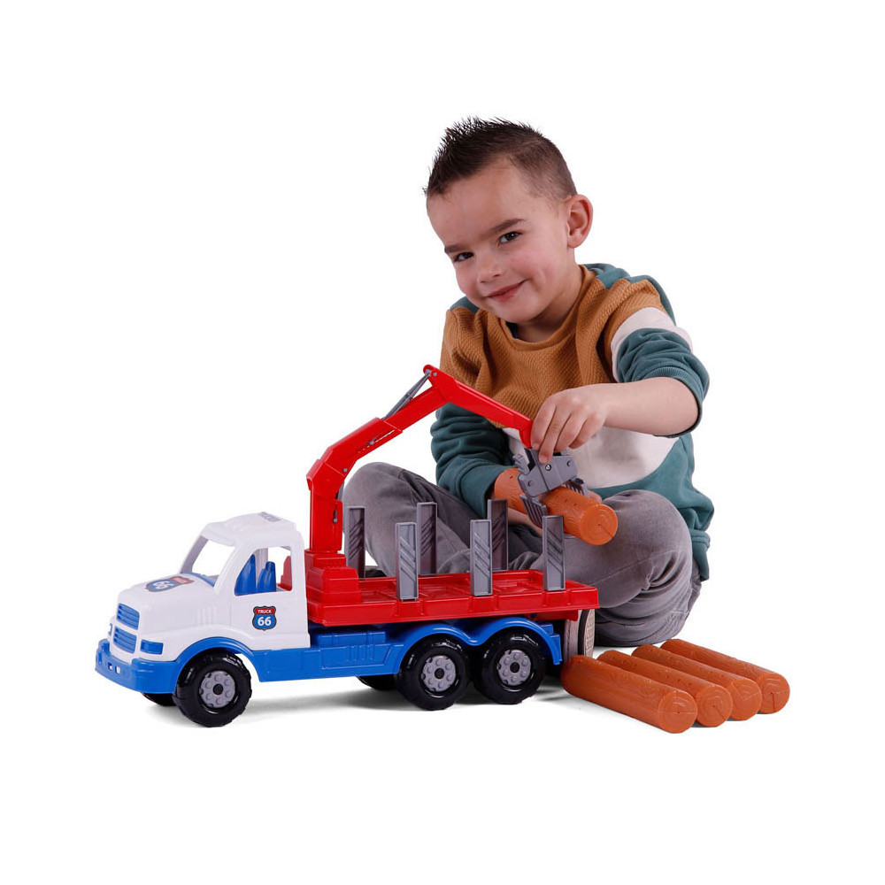 Deze grote vrachtwagen vervoert grote boomstammen! Met de grijparm tilt hij de boomstammen moeiteloos van de grond en laadt hij ze in zijn aanhanger. Wanner ze op de plaats van bestemming zijn gekomen, laadt hij de boomstammen weer uit. Extra leuk met de andere voertuigen uit deze serie van Cavallino. De boomstammen passen ook in de kiepbak van de XL Torpedo Tipper Truck (artikelcode 1450853)