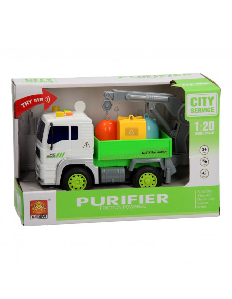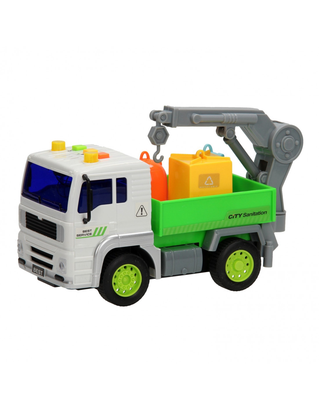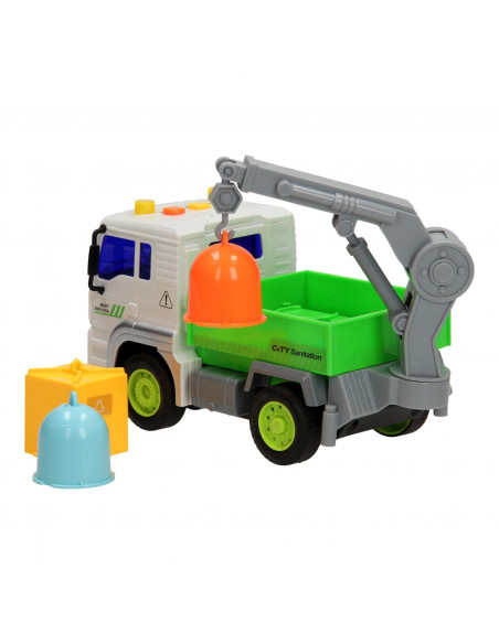 Al het glaswerk verzamelen! Deze glaswagen bevat 3 containers die je met de haak van de kraan omhoog kunt tillen en op de grond kunt zetten. De glaswagen is gemaakt van stevig kunststof en heeft rubberen banden. Wanneer je op de knoppen drukt boven de cabine van de glaswagen gaan de zwaailichten branden en maakt de glaswagen geluid. De glaswagen is gemaakt op een modelschaal van 1:20. Werkt op 3 knoopcelbatterijen (batterijen zijn inbegrepen).