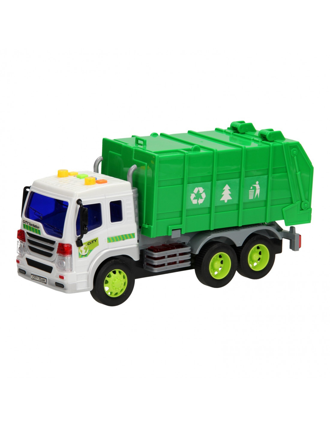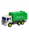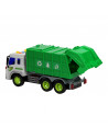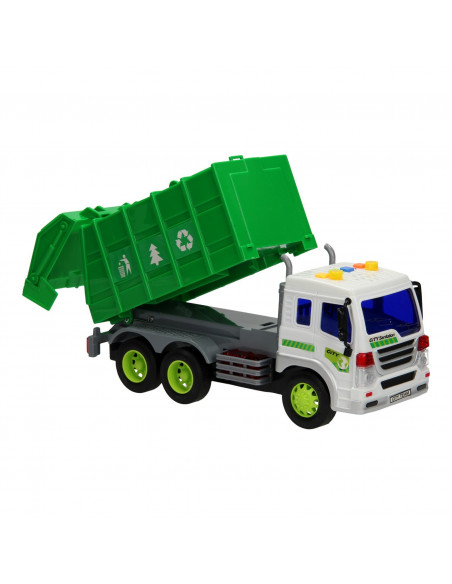 De vuilniswagen is de opruimer van de stad. Met 1 druk op de grijze knop onder de groene vuilniscontainer kiep je de container zo om en stort je het afval op de vuilnisbelt. De vuilniswagen is gemaakt van stevig kunststof en heeft rubberen banden. Wanneer je op de knoppen drukt boven de cabine van de vuilniswagen gaan de zwaailichten branden en maakt de vuilniswagen geluid. De vuilniswagen is gemaakt op een modelschaal van 1:16. Werkt op 3 knoopcelbatterijen (batterijen zijn inbegrepen).