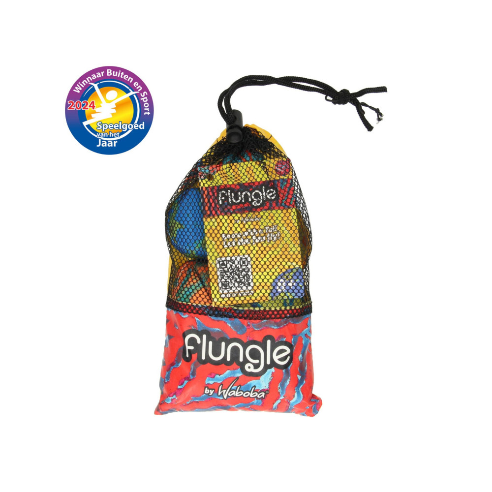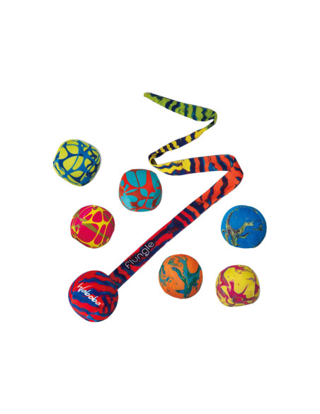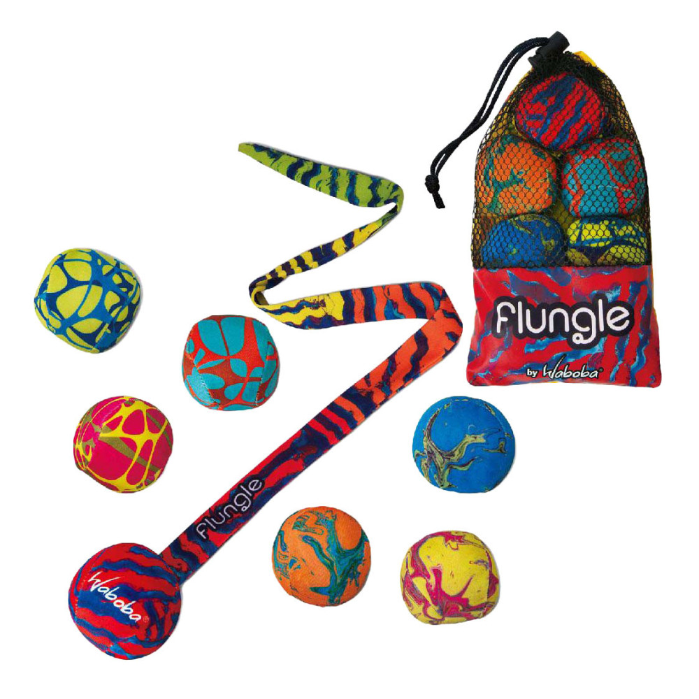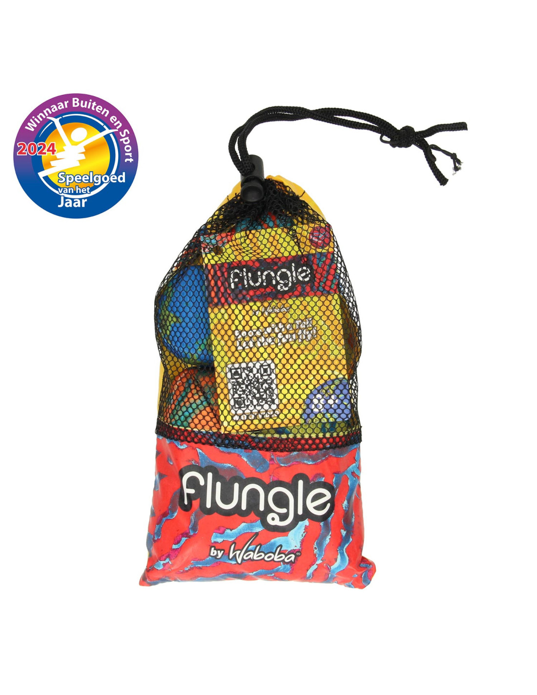 De flungle is een leuk balspel voor buiten (eventueel binnen), dat lijkt op jeu de boules. Het spel bestaat uit zeven balletjes van zo’n 5 cm, waarvan een balletje met een staart. Het balletje met de staart wordt met een slingerbeweging geworpen, waarna de spelers (maximaal zes), moeten proberen hun balletje(s) zo dicht mogelijk bij de bal met de staart te gooien. Deze staart heeft stukken van zo’n 10 cm met verschillende kleuren en wordt gebruikt om te meten hoeveel punten elke speler heeft. Hoe dichter bij hoe meer punten. De balletjes zijn van kleurrijk textiel en gevuld met zand. Ze zijn zacht en zien er vrolijk uit. Heel leuk zomerspel om met vrienden of de hele familie te spelen, en eigenlijk prima geschikt voor alle seizoenen en bijna alle leeftijden. Goed voor de oog-handcoordinatie, motorische ontwikkeling van jonge kinderen en richtinggevoel. Ook goed om te leren om met spelverlies om te gaan. Laat daarom jongere kinderen van dichterbij gooien, zodat ze ook af en toe kunnen winnen. Vooral heel veel gezellig en actief samenspelen.