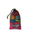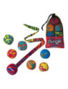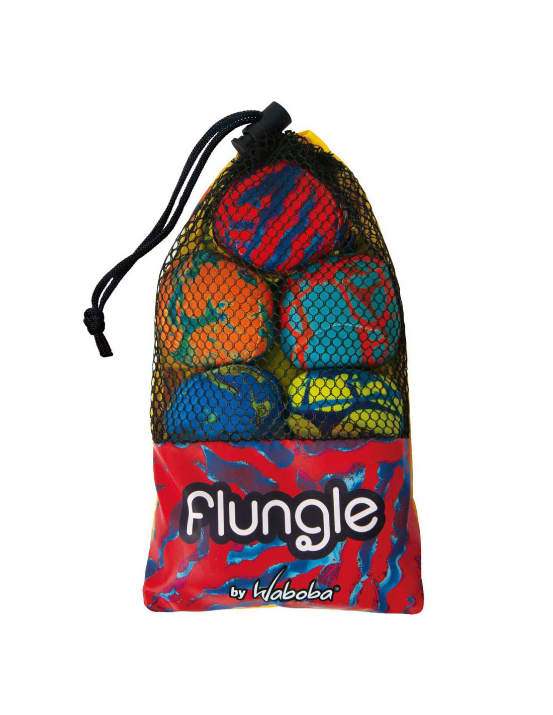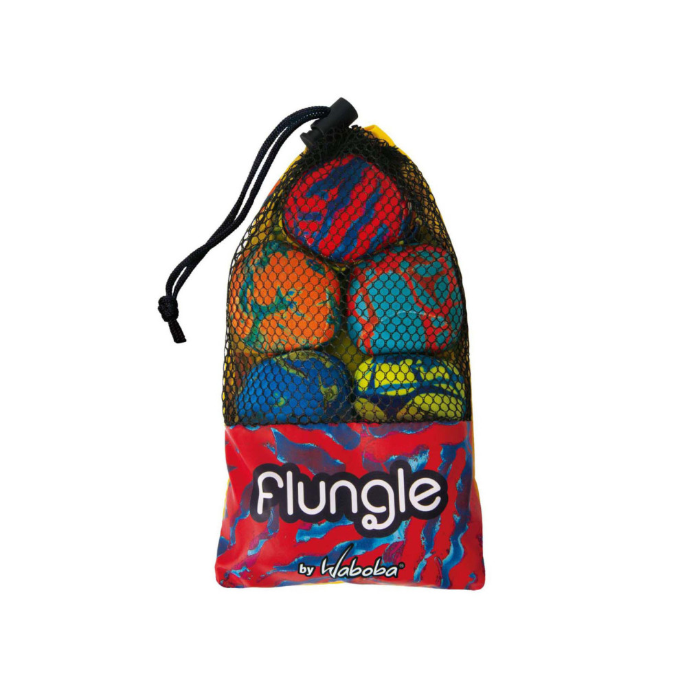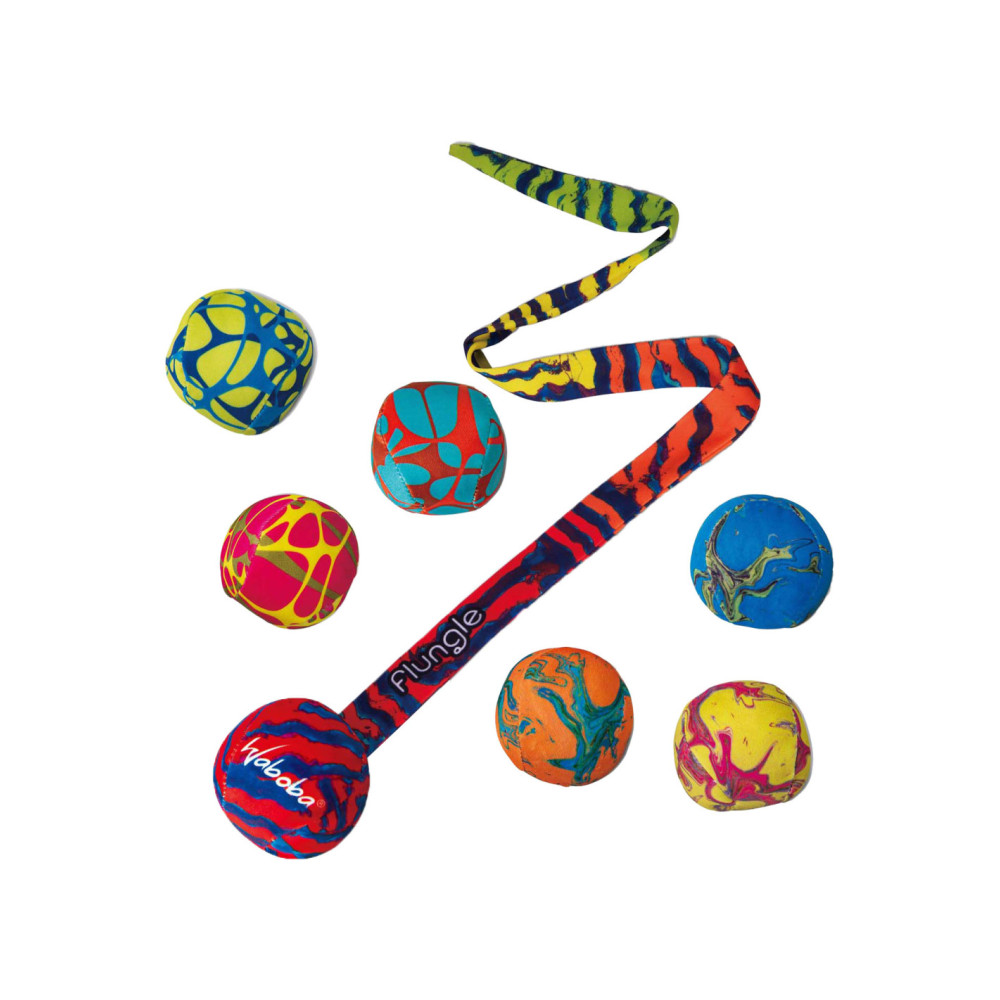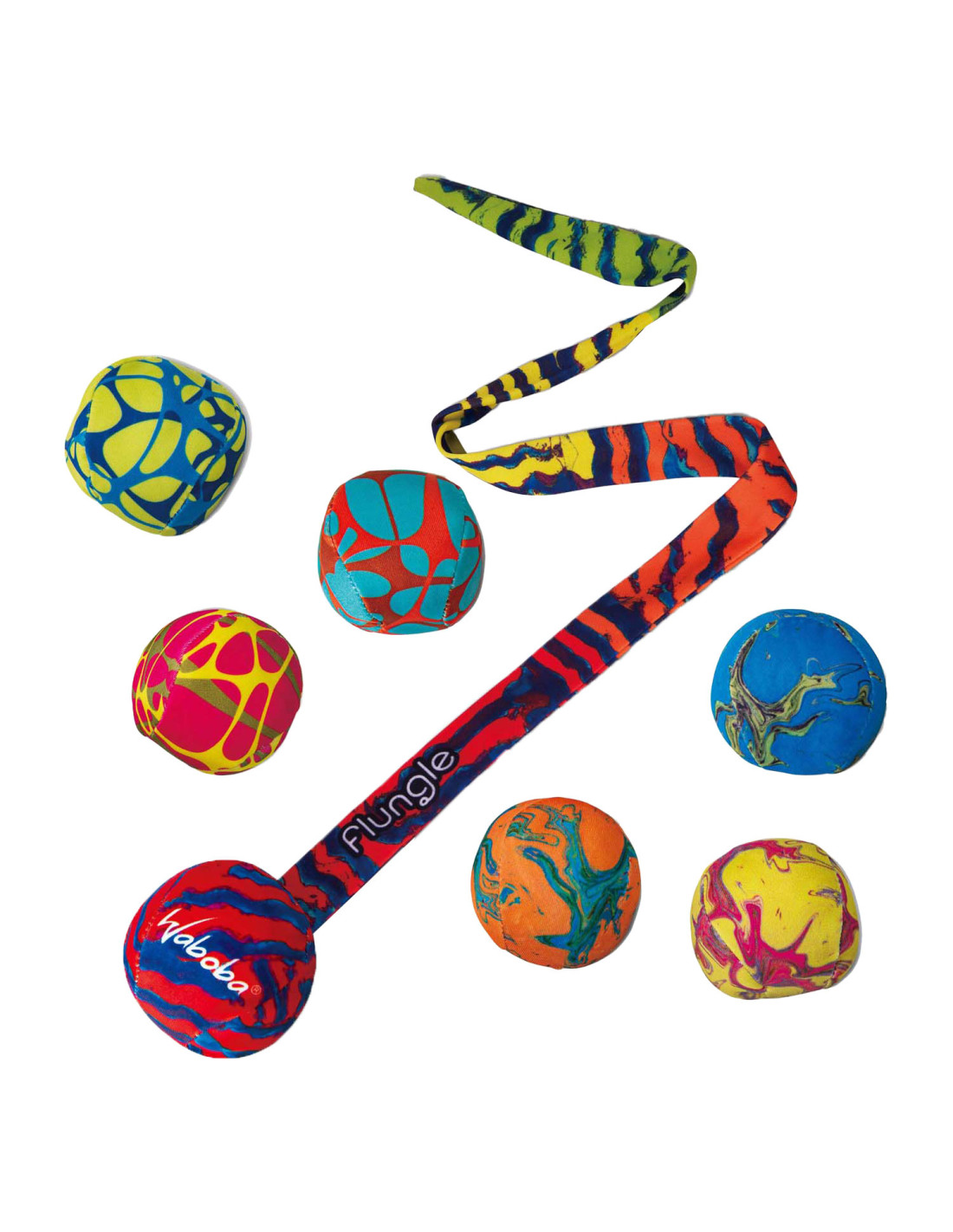 De flungle is een leuk balspel voor buiten (eventueel binnen), dat lijkt op jeu de boules. Het spel bestaat uit zeven balletjes van zo’n 5 cm, waarvan een balletje met een staart. Het balletje met de staart wordt met een slingerbeweging geworpen, waarna de spelers (maximaal zes), moeten proberen hun balletje(s) zo dicht mogelijk bij de bal met de staart te gooien. Deze staart heeft stukken van zo’n 10 cm met verschillende kleuren en wordt gebruikt om te meten hoeveel punten elke speler heeft. Hoe dichter bij hoe meer punten. De balletjes zijn van kleurrijk textiel en gevuld met zand. Ze zijn zacht en zien er vrolijk uit. Heel leuk zomerspel om met vrienden of de hele familie te spelen, en eigenlijk prima geschikt voor alle seizoenen en bijna alle leeftijden. Goed voor de oog-handcoordinatie, motorische ontwikkeling van jonge kinderen en richtinggevoel. Ook goed om te leren om met spelverlies om te gaan. Laat daarom jongere kinderen van dichterbij gooien, zodat ze ook af en toe kunnen winnen. Vooral heel veel gezellig en actief samenspelen.