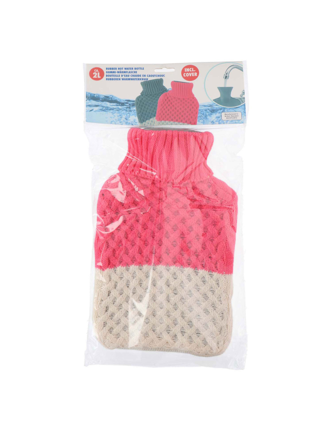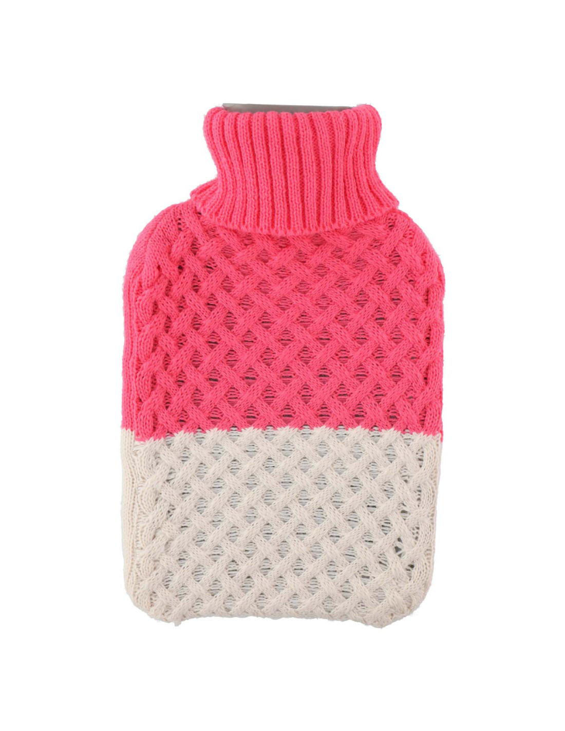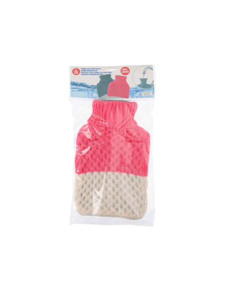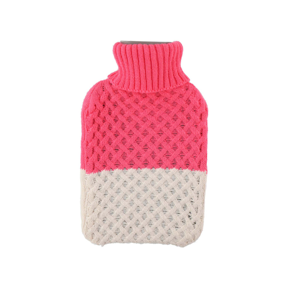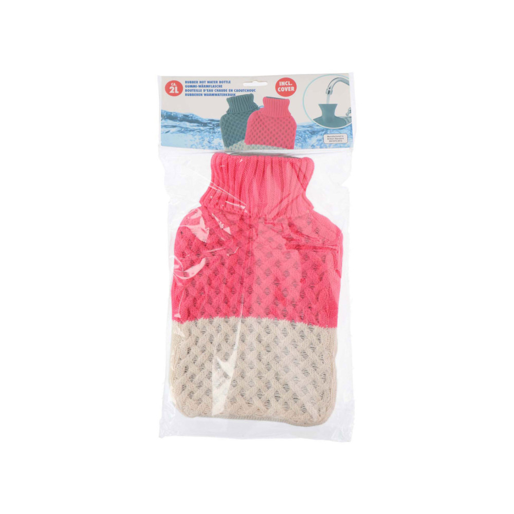 Beige/roze warmwaterkruik met een inhoud van 1,7 liter. De kruik heeft een zachte hoes met coltrui-look. Afmetingen: 5,8 x 20,5 x 32,5 centimeter.
