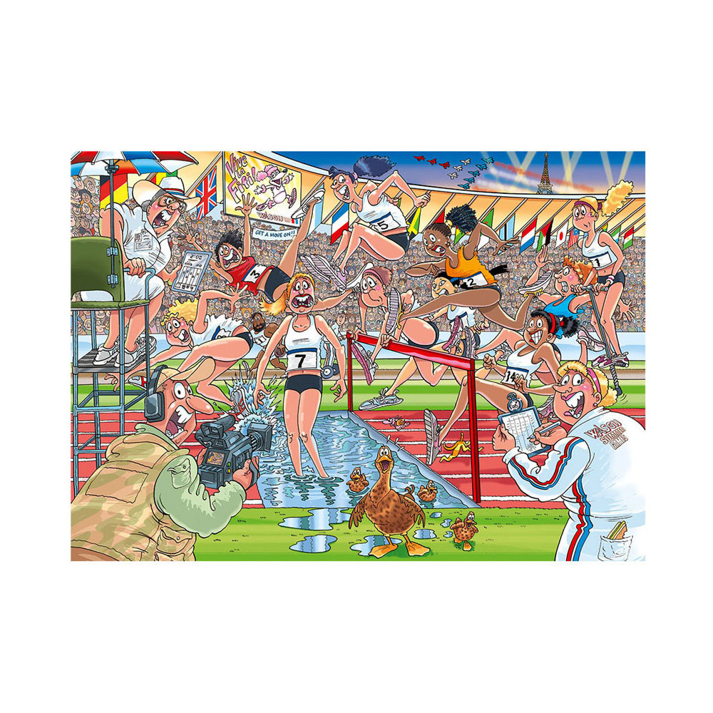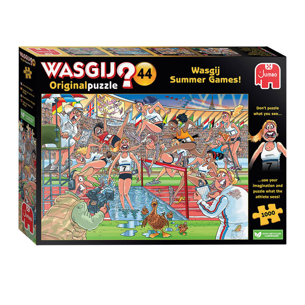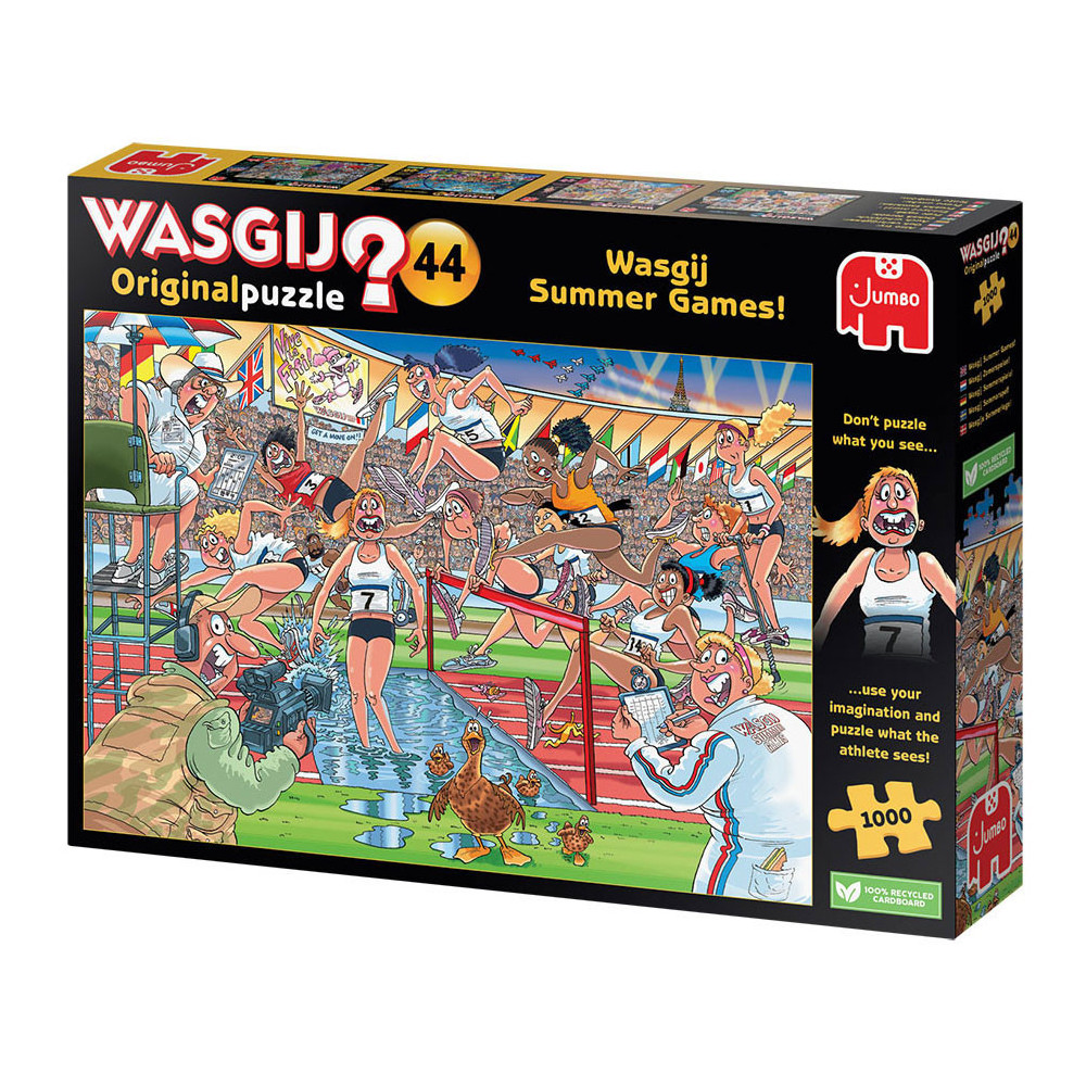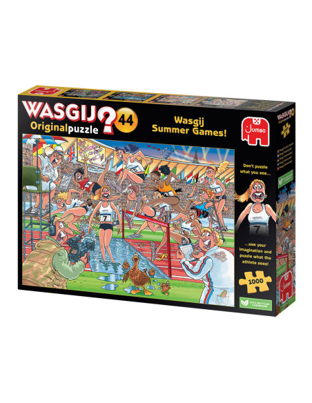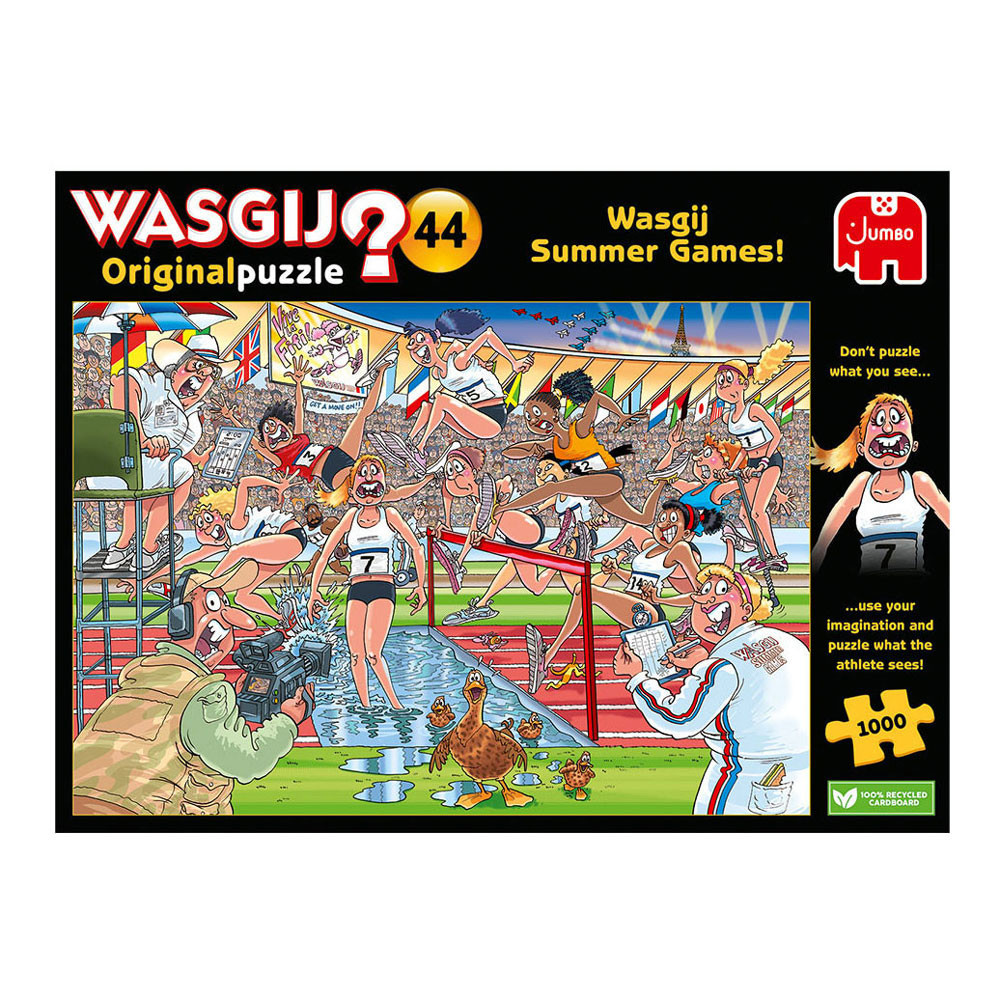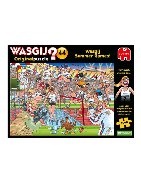 Iedereen staat gereed, startklaar, en daar gaan we bij de Wasgij Zomerspelen. Het publiek in het stadion staat op, de pers en camera's staan langs de baan, de atleten zijn... uh-oh! Ze rennen alle kanten op! Iets onverwachts brengt onze hindernislopers van hun stuk.Wat zouden de atleten gezien hebben dat zo afleidend is? Heeft alle training zijn vruchten afgeworpen, of staat er een onverwachte concurrent klaar om voor goud te gaan? Dat is het tafereel dat je moet puzzelen.Kenmerken:- Legpuzzel van 1000 stukjes voor volwassenen- Puzzel niet de afbeelding van de doos, maar gebruik je verbeelding om de Wasgij oplossing bij elkaar te puzzelen!- Afmeting gelegde puzzel: 68 x 49 cmOver WasgijDeze Wasgij legpuzzels van Jumbo zijn speciaal ontwikkelt voor volwassenen. Anders dan bij andere puzzels, maak je bij Wasgij niet een afbeelding van de doos na maar moet je zelf je fantasie gebruiken om de puzzelplaat compleet te maken! Er zijn drie verschillende concepten: Original, Mystery en Destiny. Bij Wasgij Mystery moet je de hints en je fantasie gebruiken om er achter te komen hoe het tafereel er in de toekomst uit zal zien. Het unieke Wasgij concept stimuleert volwassenen om hun fantasie te gebruiken!