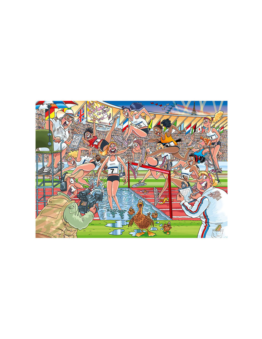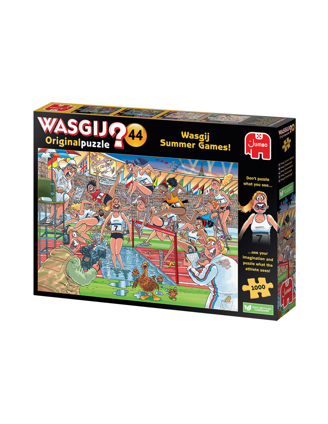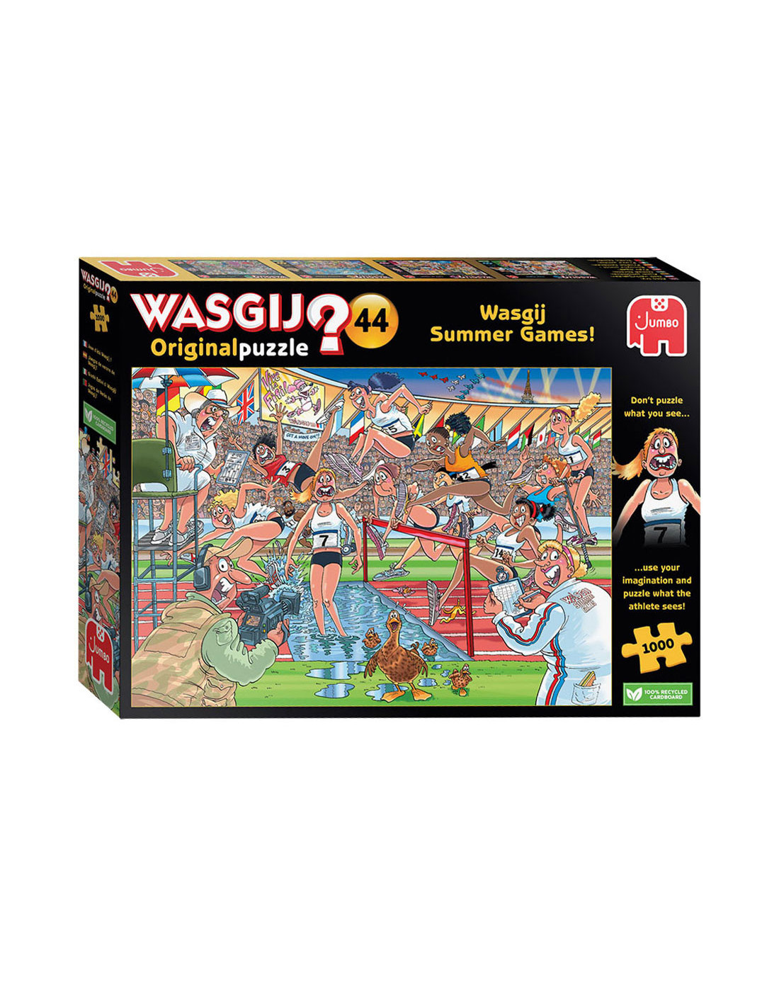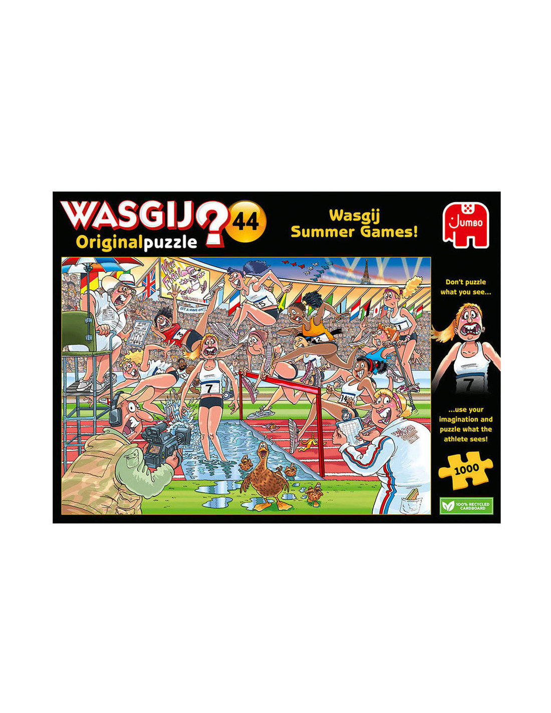 Iedereen staat gereed, startklaar, en daar gaan we bij de Wasgij Zomerspelen. Het publiek in het stadion staat op, de pers en camera's staan langs de baan, de atleten zijn... uh-oh! Ze rennen alle kanten op! Iets onverwachts brengt onze hindernislopers van hun stuk.Wat zouden de atleten gezien hebben dat zo afleidend is? Heeft alle training zijn vruchten afgeworpen, of staat er een onverwachte concurrent klaar om voor goud te gaan? Dat is het tafereel dat je moet puzzelen.Kenmerken:- Legpuzzel van 1000 stukjes voor volwassenen- Puzzel niet de afbeelding van de doos, maar gebruik je verbeelding om de Wasgij oplossing bij elkaar te puzzelen!- Afmeting gelegde puzzel: 68 x 49 cmOver WasgijDeze Wasgij legpuzzels van Jumbo zijn speciaal ontwikkelt voor volwassenen. Anders dan bij andere puzzels, maak je bij Wasgij niet een afbeelding van de doos na maar moet je zelf je fantasie gebruiken om de puzzelplaat compleet te maken! Er zijn drie verschillende concepten: Original, Mystery en Destiny. Bij Wasgij Mystery moet je de hints en je fantasie gebruiken om er achter te komen hoe het tafereel er in de toekomst uit zal zien. Het unieke Wasgij concept stimuleert volwassenen om hun fantasie te gebruiken!