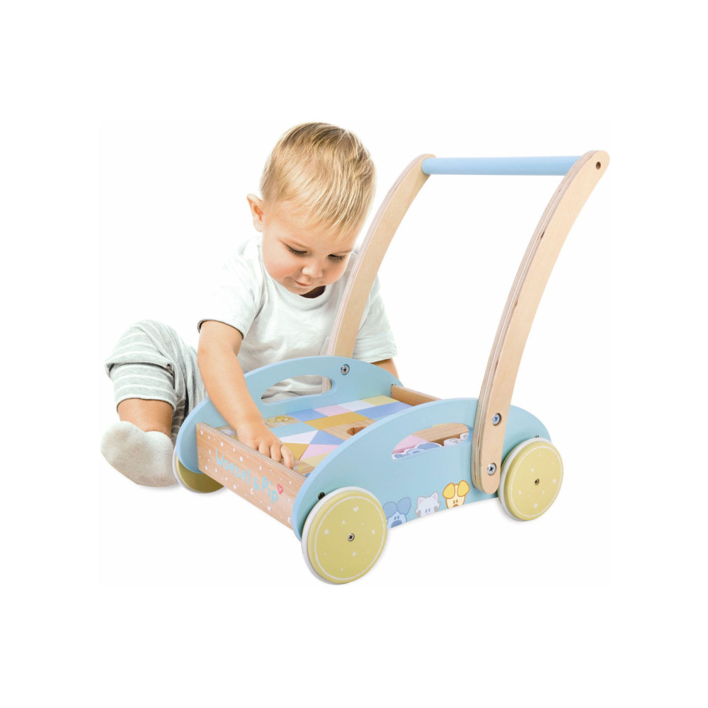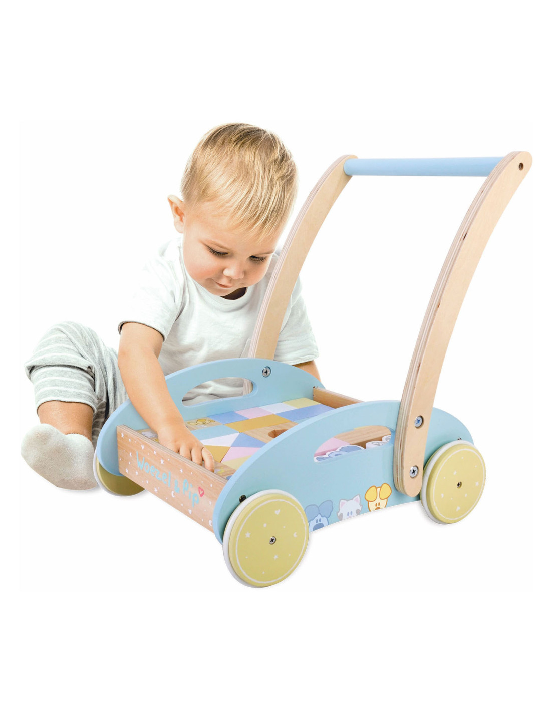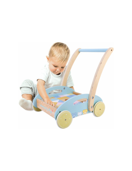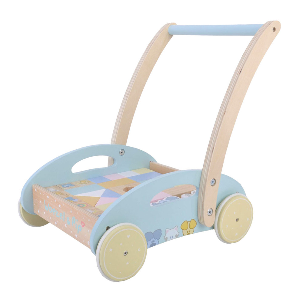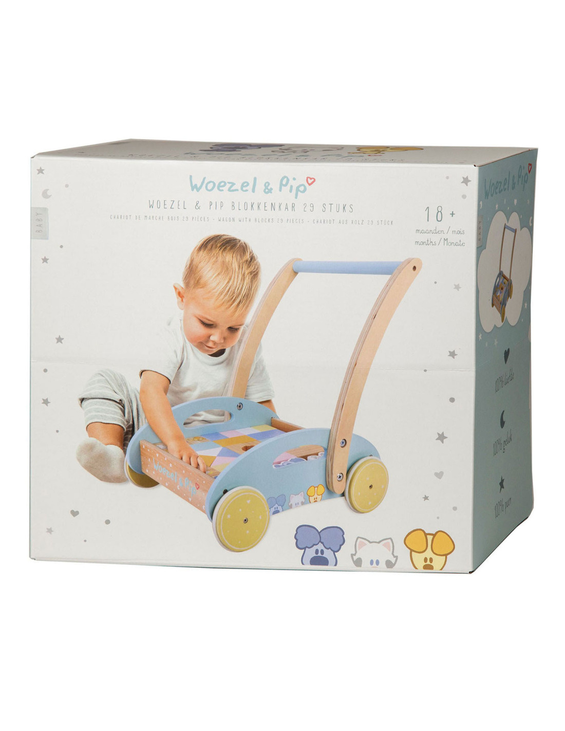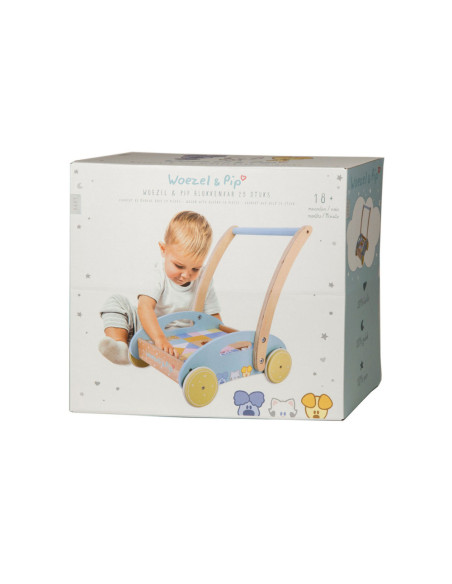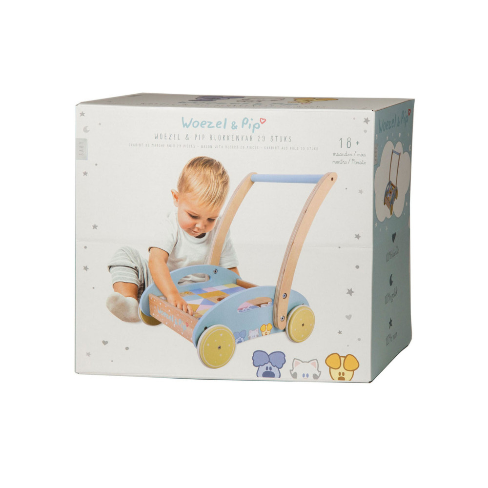 Deze houten baby blokkenkar van Woezel en Pip is een feestje voor ieder kind. De kar is voorzien van houten wielen en is gevuld met gekleurde blokjes en 3 speelfiguren. De verschillende formaten blokjes stimuleren de ontwikkeling en staan garant voor uren speel- en bouwplezier. Het product is niet bedoeld om je kindje te leren lopen. Houd er daarom rekening mee dat een kind zelfstandig en vrij moet kunnen lopen voordat hij de blokkenkar gebruikt om mee te lopen. Dit om te voorkomen dat je kind voorover valt en bezeert. Afmeting: 27 x 35 x 36 cm.