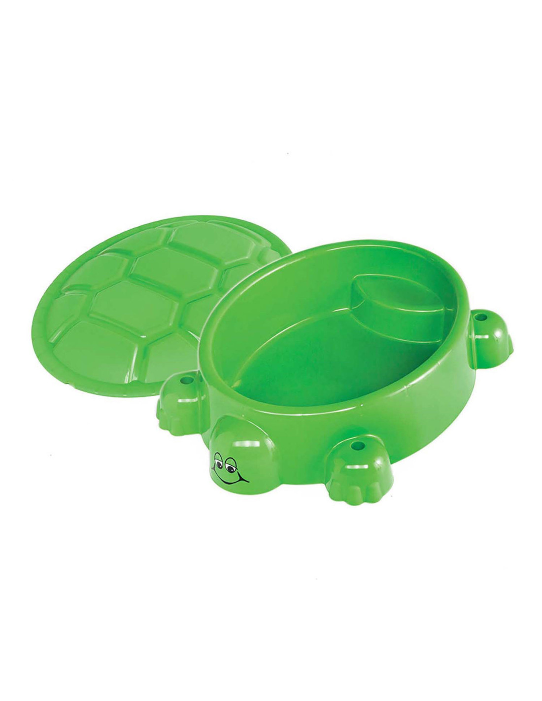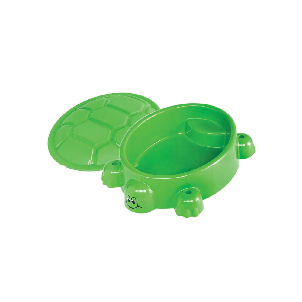 De Paradiso Toys Zandbak "Turty Smile" is een groene kunststof zandbak in de vorm van een vrolijke schildpad, geschikt voor kinderen vanaf 18 maanden. De zandbak wordt geleverd met een bijpassend deksel dat het zand beschermt tegen regen en vuil. Dankzij het compacte formaat en lichte gewicht is hij ideaal voor elke tuin en eenvoudig op te bergen. Afmetingen: 95,5 x 68 x 27 cm.