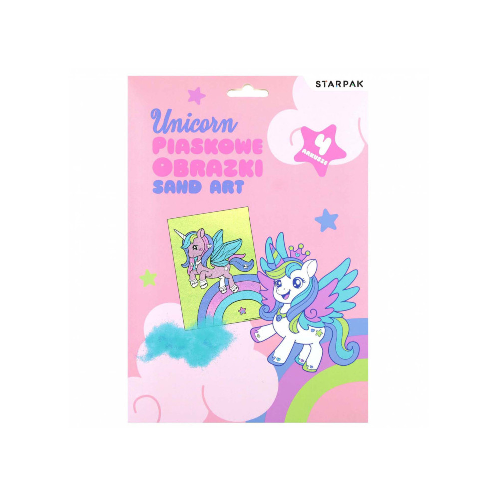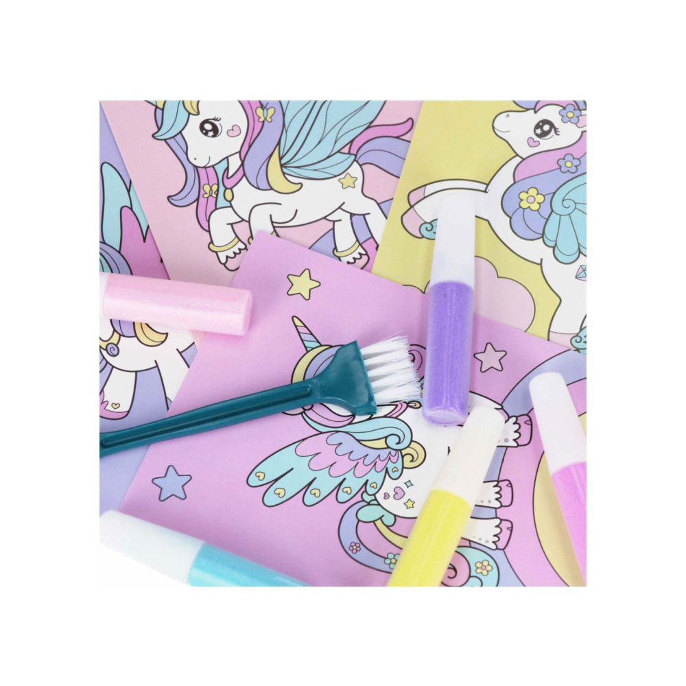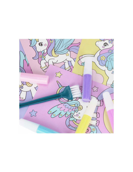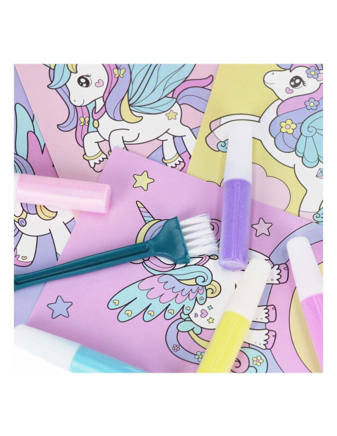 Met deze set kun je prachtige tekeningen maken met je favoriete eenhoorn. Schilderen met zand stimuleert de creativiteit van je kind en leert geduld. Concentratie op een taak die resulteert in handgemaakte, kleurrijke decoraties zal elk kind veel voldoening geven. De set bevat: 4 kleurplaten, 5 tubes gekleurd zand en een kwast.