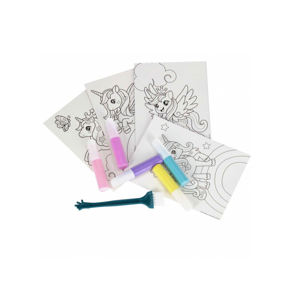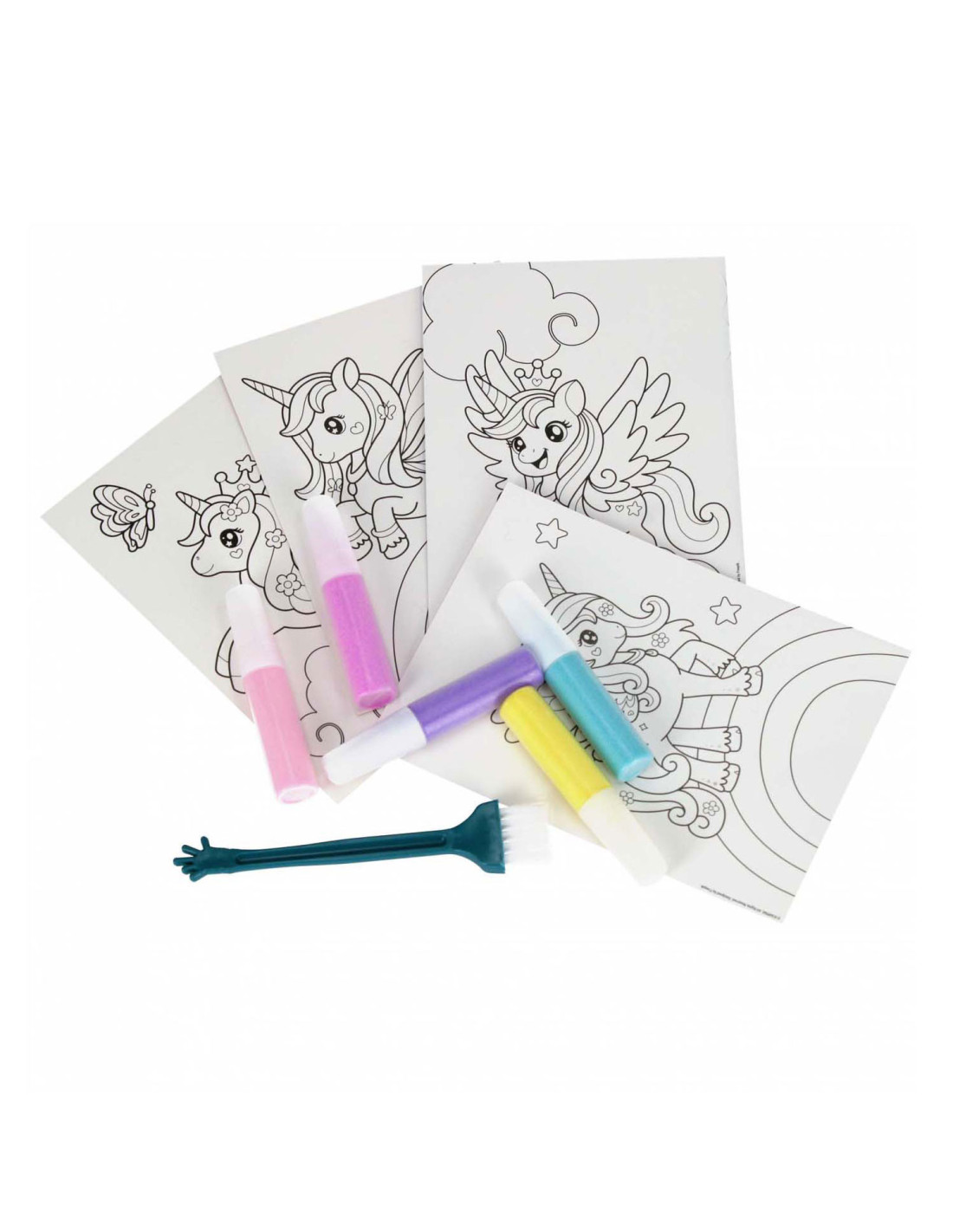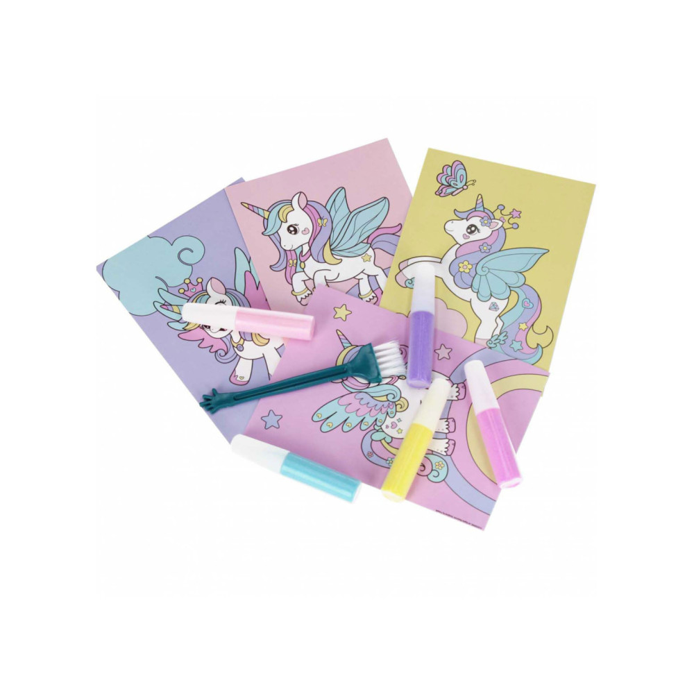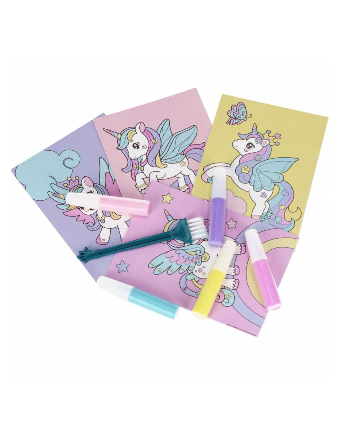 Met deze set kun je prachtige tekeningen maken met je favoriete eenhoorn. Schilderen met zand stimuleert de creativiteit van je kind en leert geduld. Concentratie op een taak die resulteert in handgemaakte, kleurrijke decoraties zal elk kind veel voldoening geven. De set bevat: 4 kleurplaten, 5 tubes gekleurd zand en een kwast.